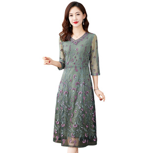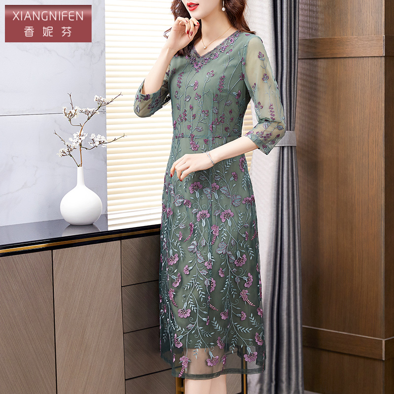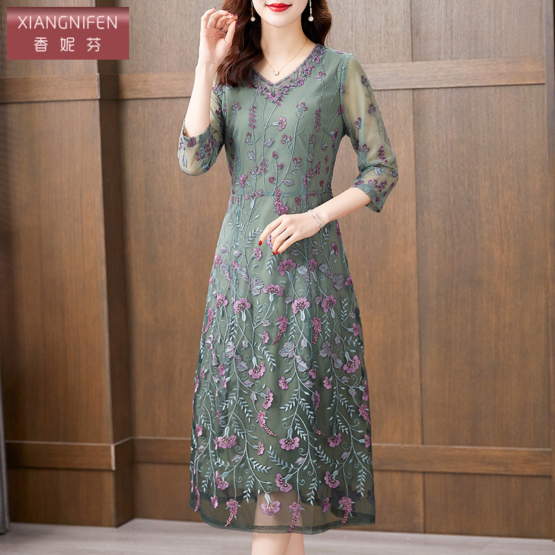 香妮芬气质洋气v领刺绣妈妈连衣裙女2025新款 碎花女神范显瘦 秋季