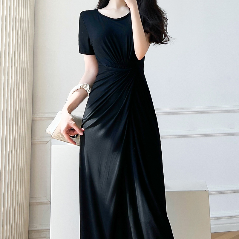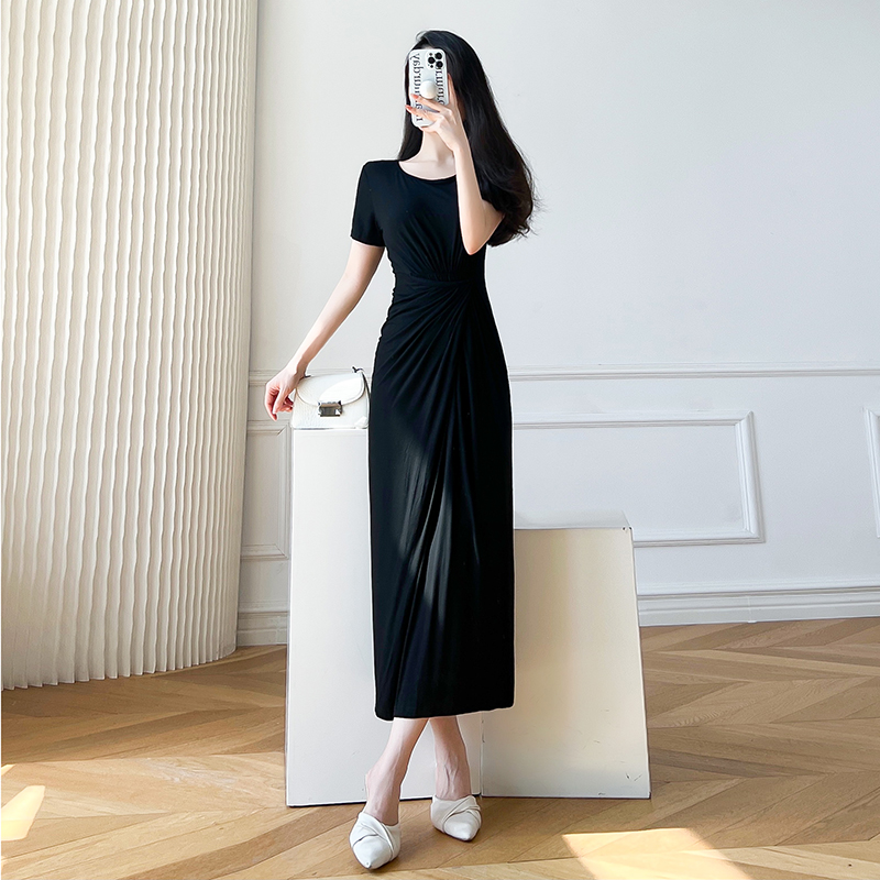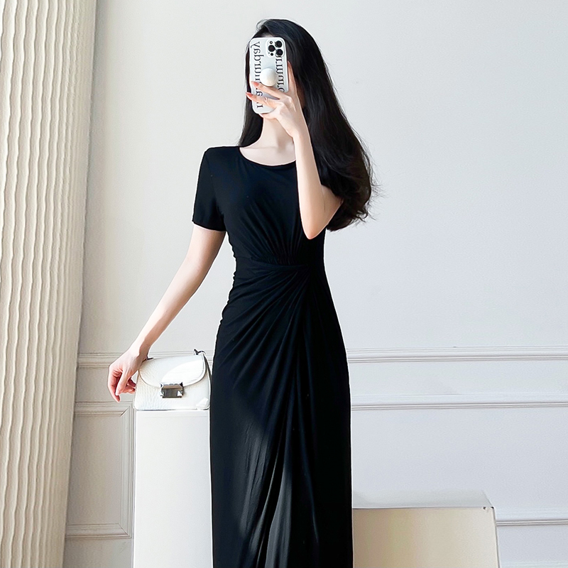 韩版 莫代尔修身 中长款 短袖 气质圆领打底长裙子 连衣裙女2025春夏季