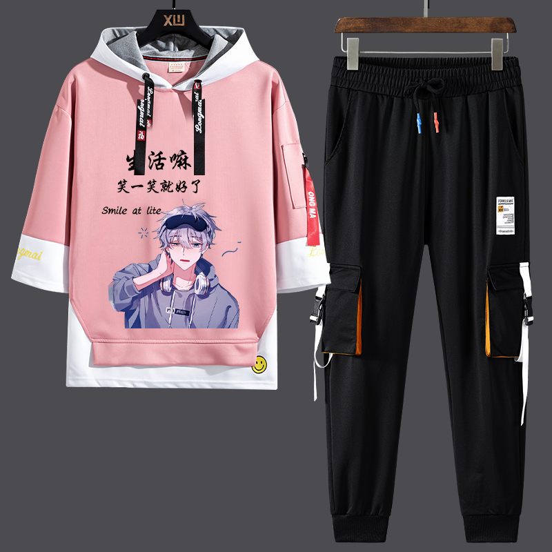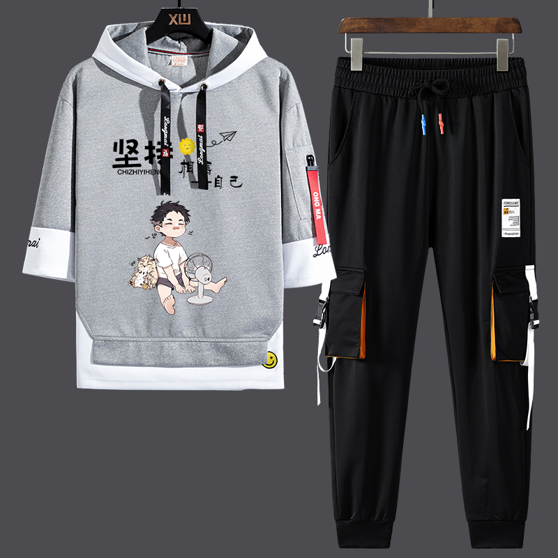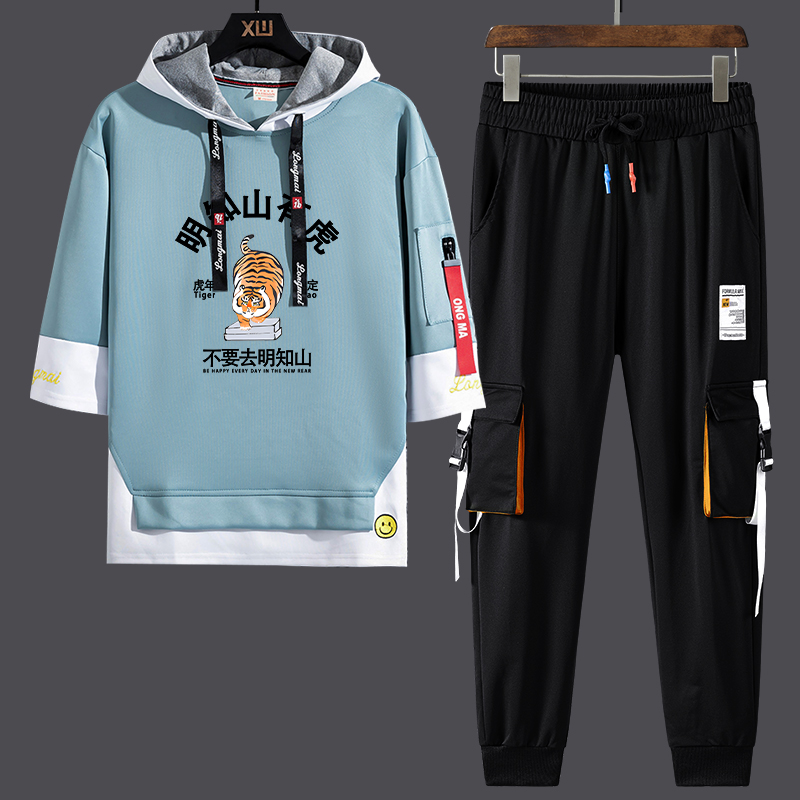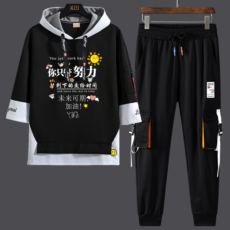 港风t恤潮牌短袖 七分袖 长裤 休闲运动套装 情侣两件套 一套男士 夏季