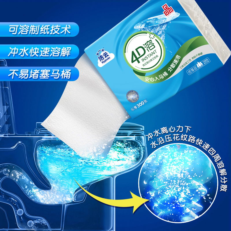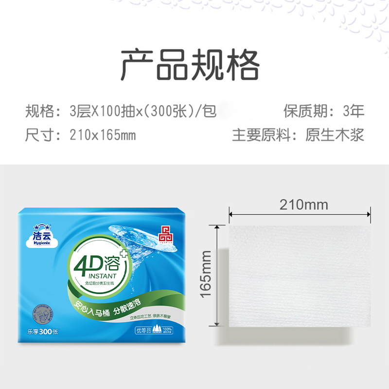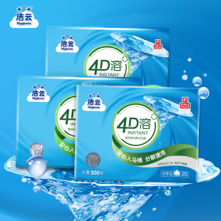 洁云4D溶方包卫生纸300张可溶性水溶刀切纸压花平板纸家用实惠装