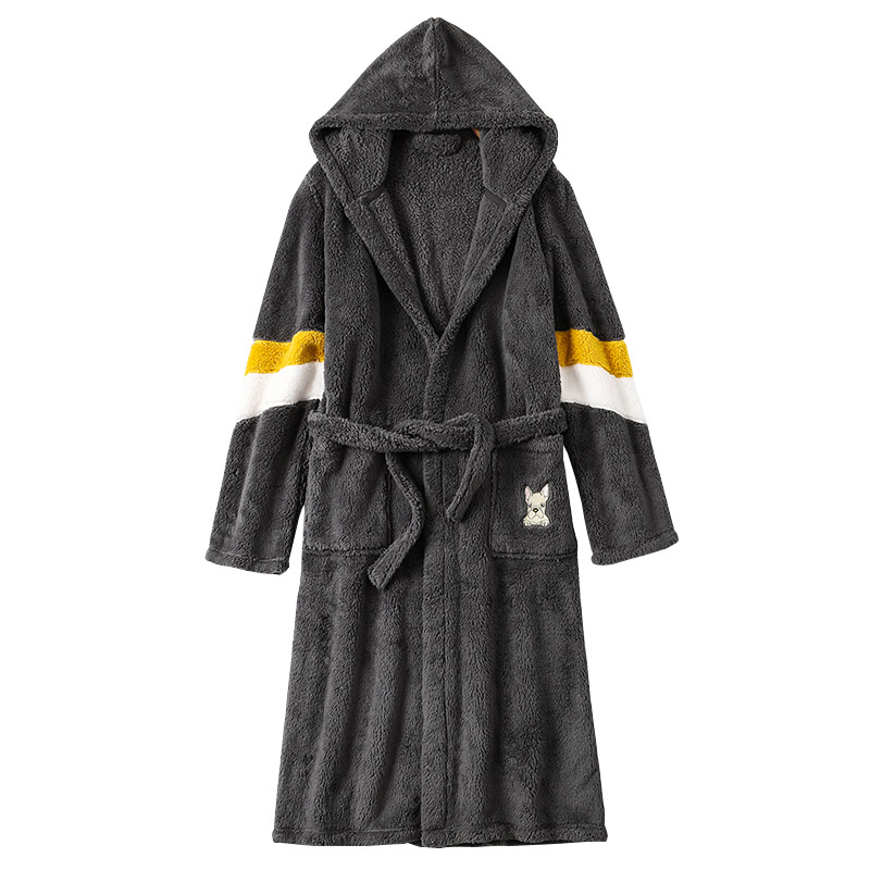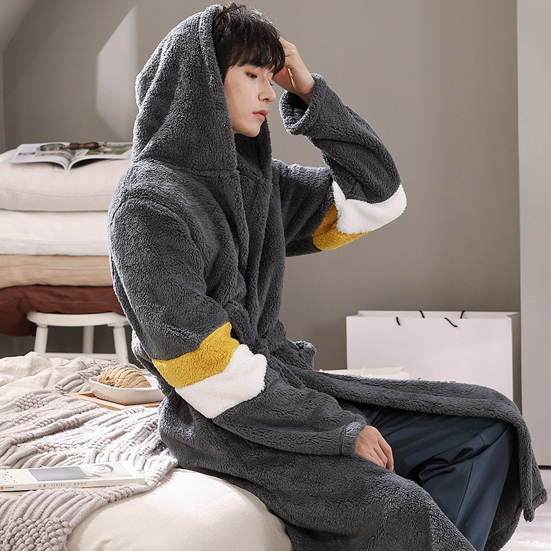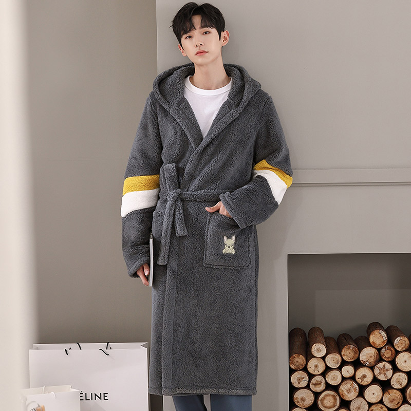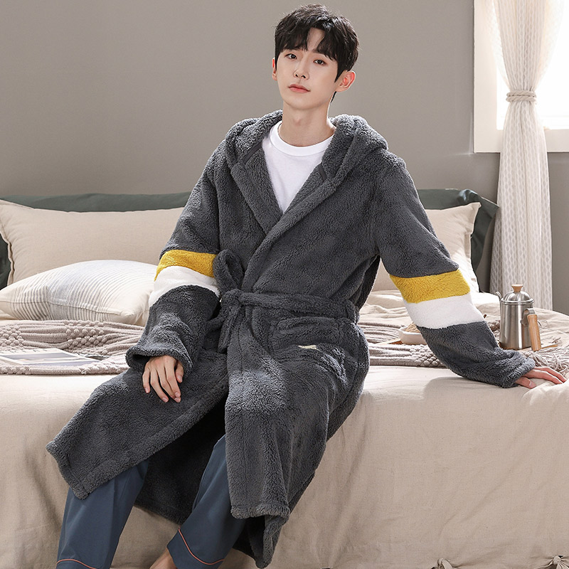 睡袍套装 法兰绒连帽加长款 珊瑚绒浴袍秋冬加绒加厚男士 睡衣男冬季