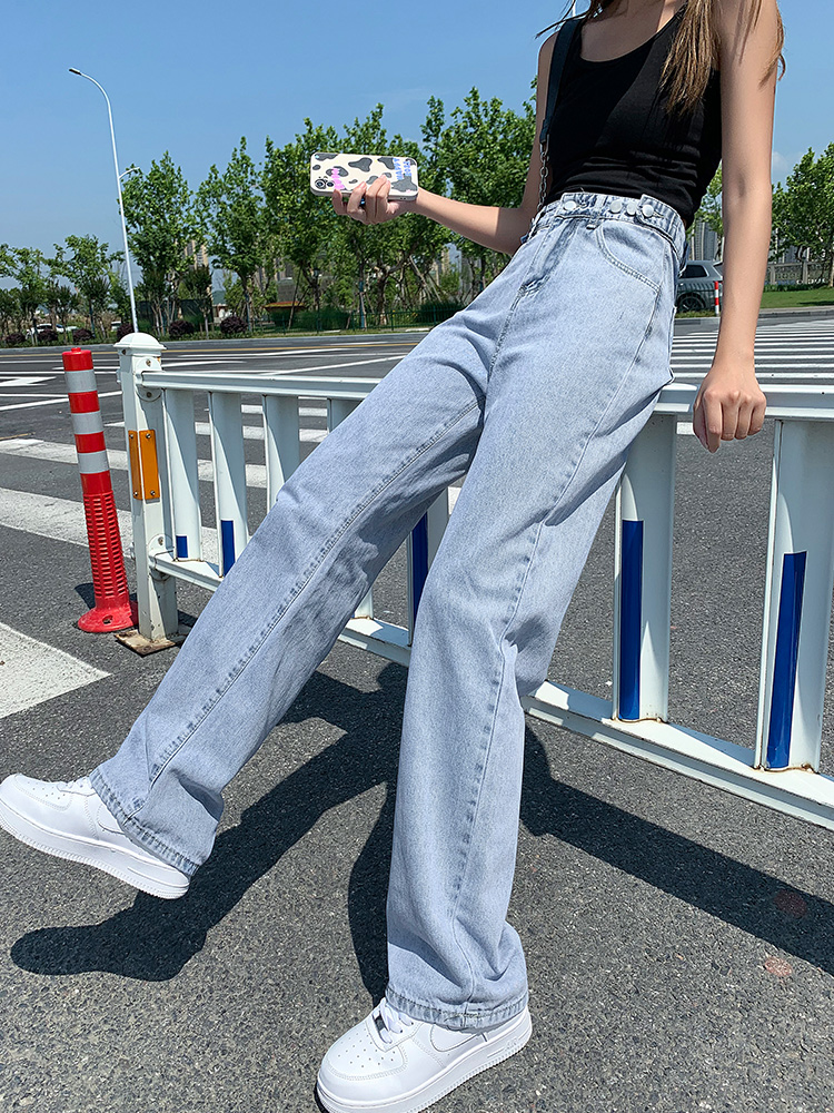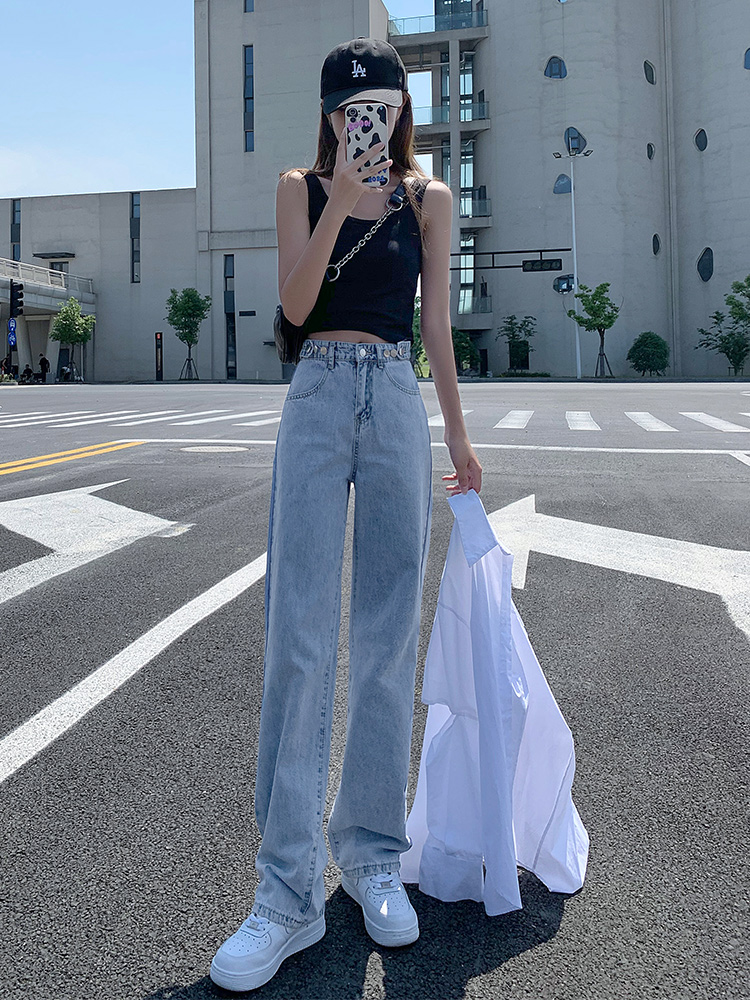 男款 高街潮牌浅蓝色阔腿裤 夏季 子美式 宽松水洗休闲长裤 直筒牛仔裤