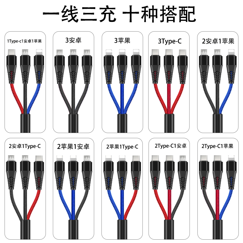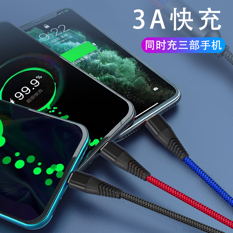 适用双头安卓一拖三数据线全安卓充电器闪充三合一华为荣耀3个type c手机快充多功能头一分三双苹果充电多头