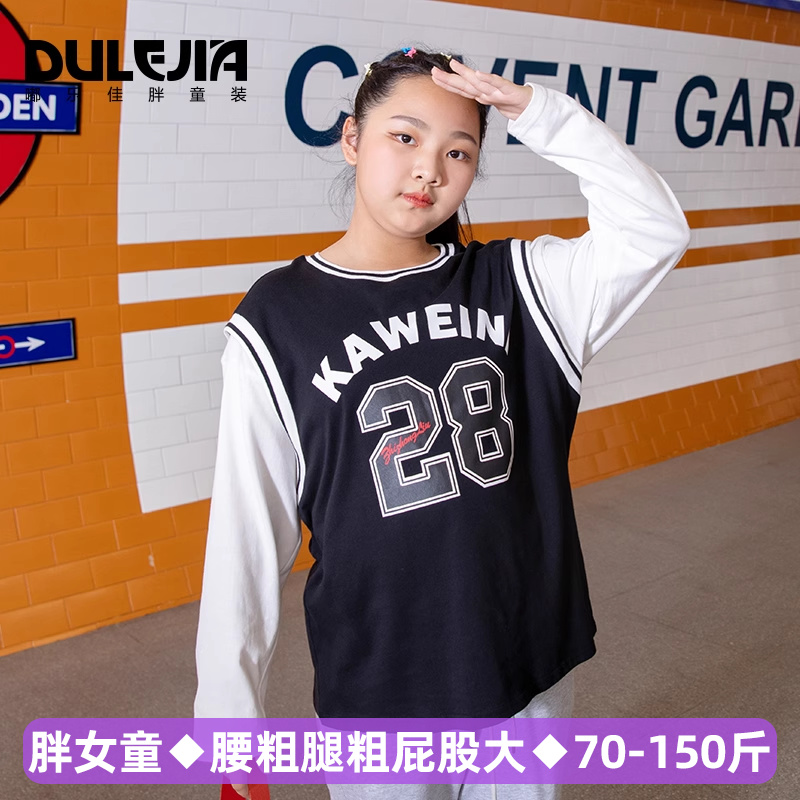 长袖 女童假两件t恤春秋加肥加大码 女大童宽松上衣 胖童装 清仓款