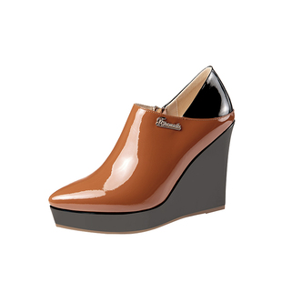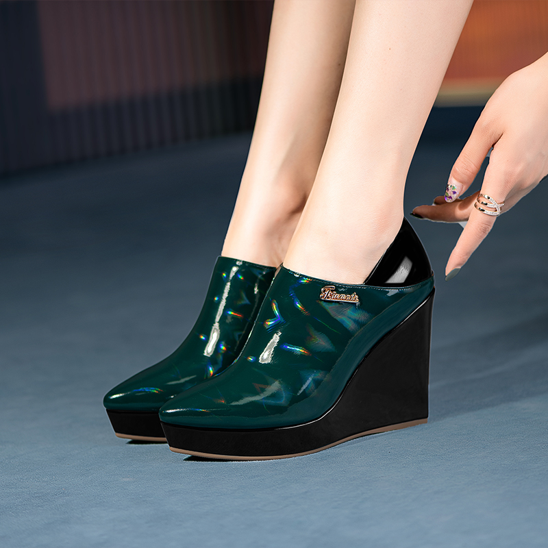 复古设计感真皮漆皮尖头防水台厚底高跟鞋 新款 女2025秋季 坡跟单鞋