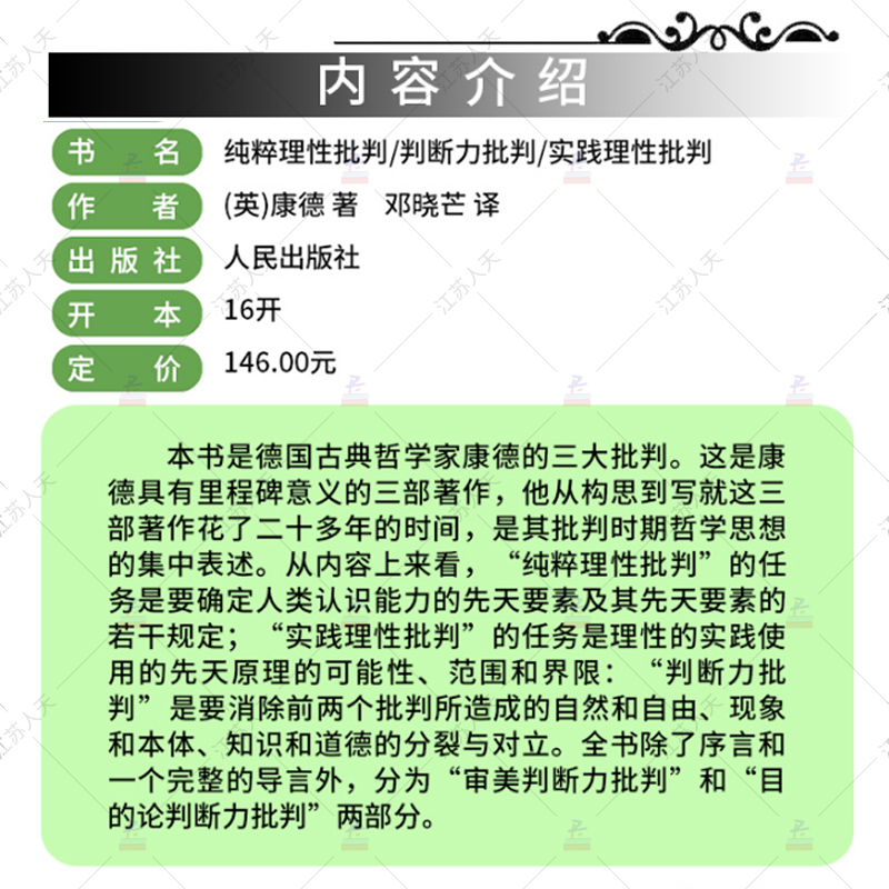 康德著作全集 纯粹理性批判 邓晓芒 人民出版 实践理性批判 康德三大批判全三册 判断力批判 哲学经典 正版 社 包邮