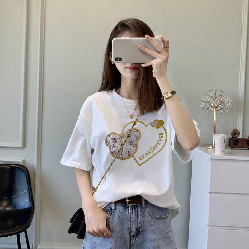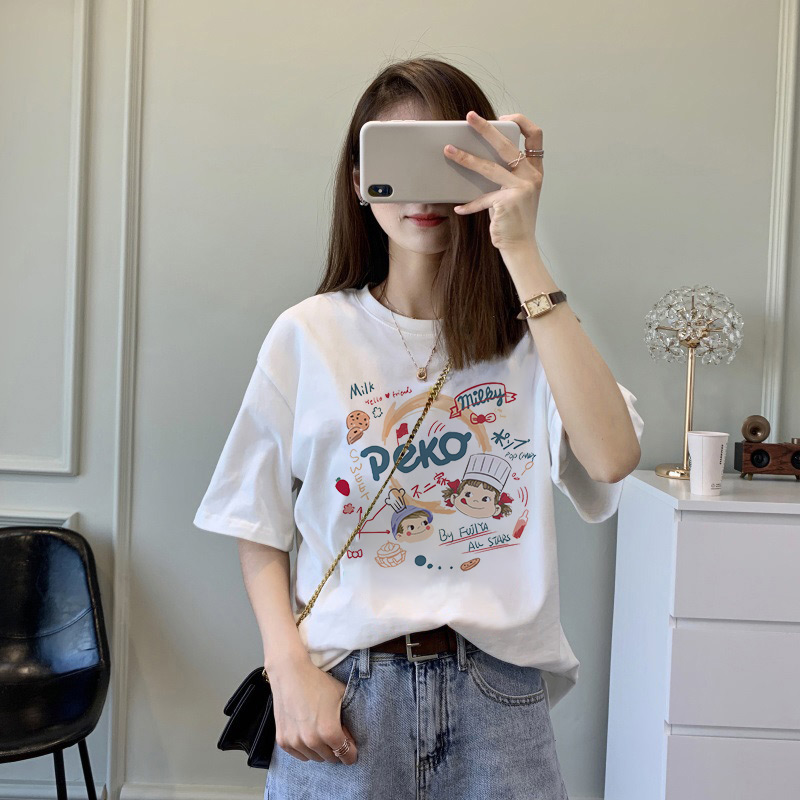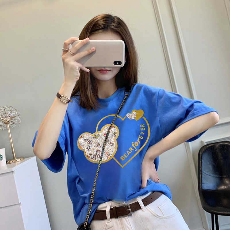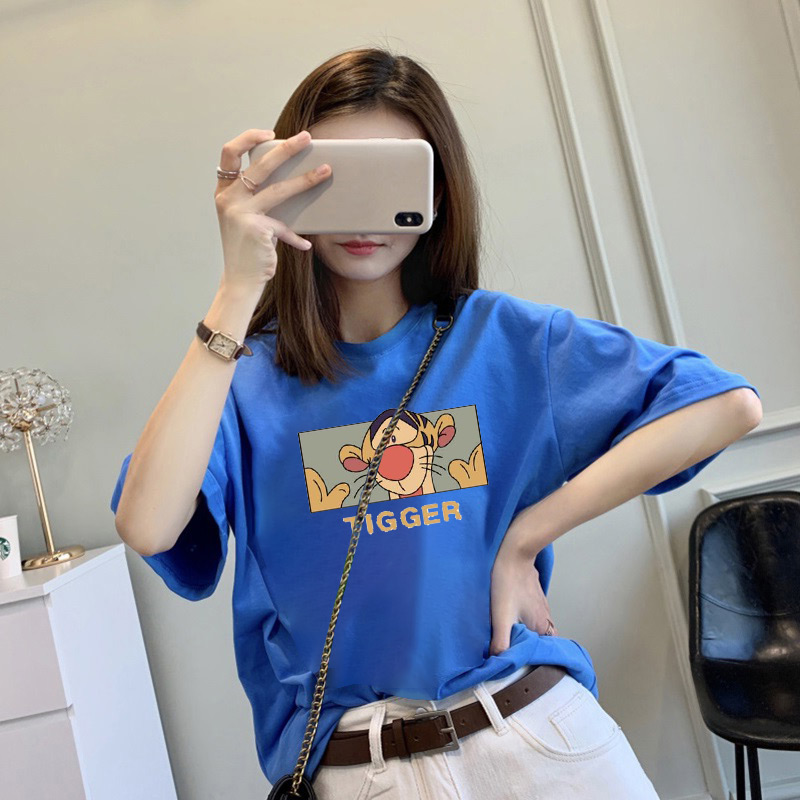 日系复古克莱因蓝纯棉短袖 卡通印花小众潮牌体恤上衣服 t恤女夏季