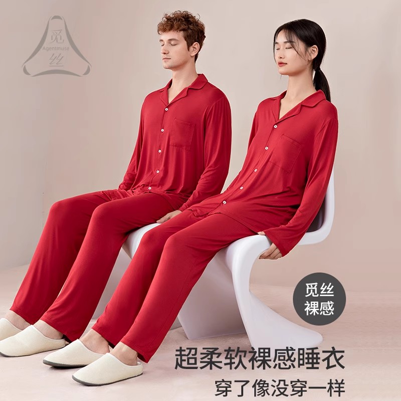 情侣家居服套装 觅丝 开衫 60S天丝莫代尔睡衣男款 睡裙女 裸感