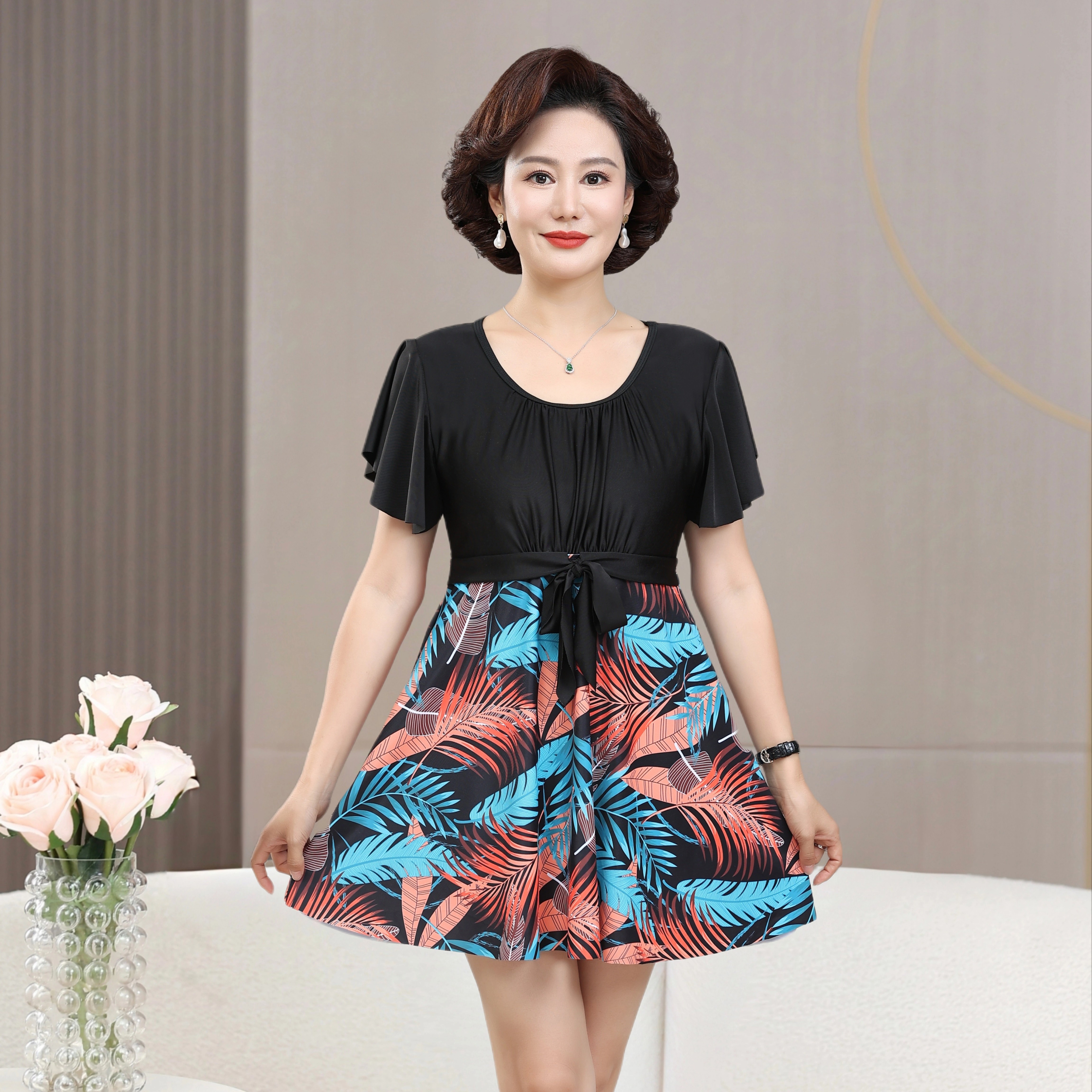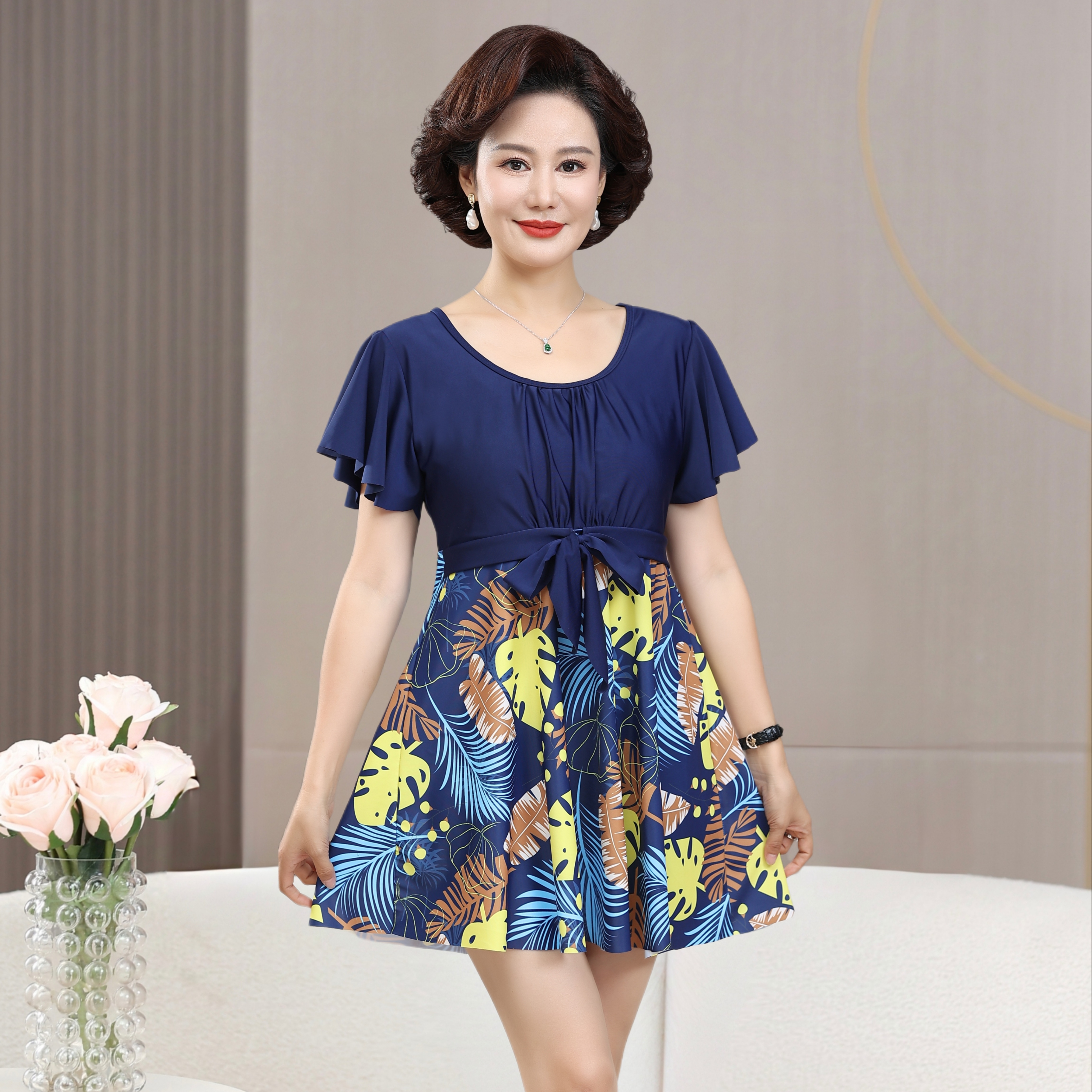 泡温泉泳装 妈妈泳衣中老年女保守分体拼接式 遮肚显瘦中年妈妈大码