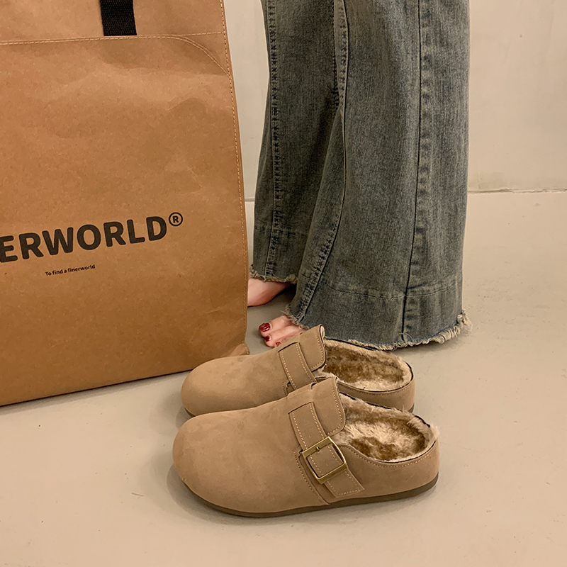 一脚蹬孕妇半拖外穿 羊羔加绒复古毛毛鞋 真皮勃肯包头棉拖鞋 女冬季