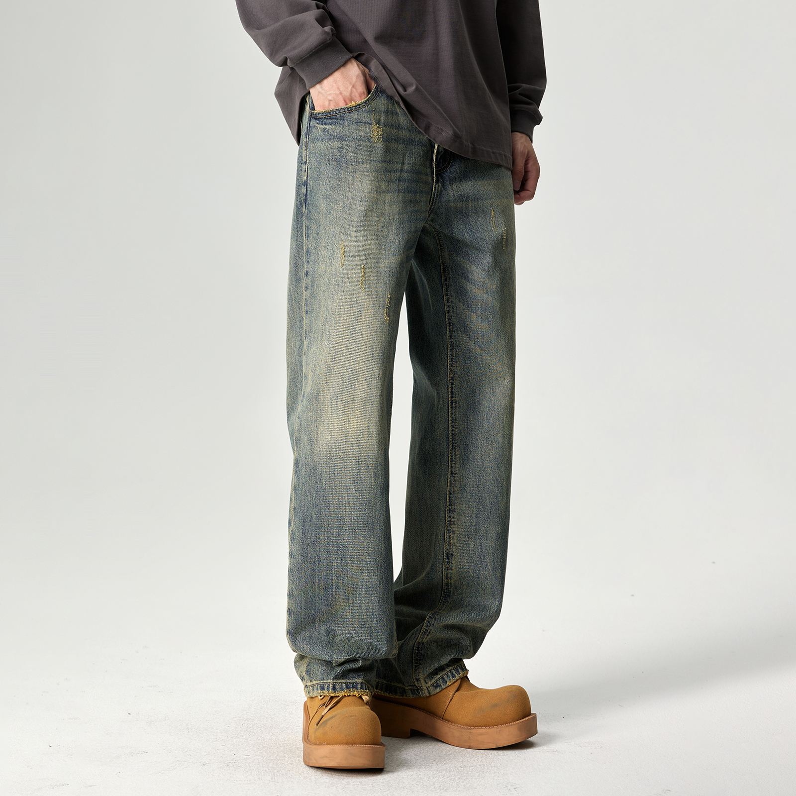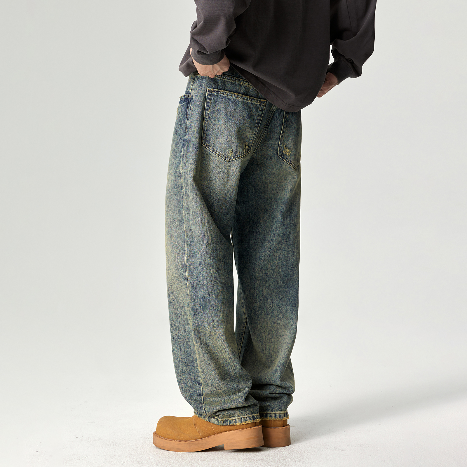 高街潮牌休闲长裤 男宽松百搭阔腿裤 子 复古吊磨水洗直筒牛仔裤 美式