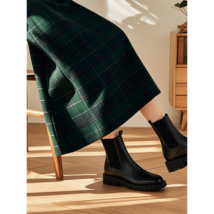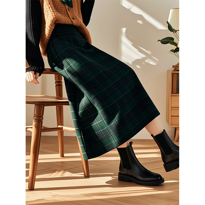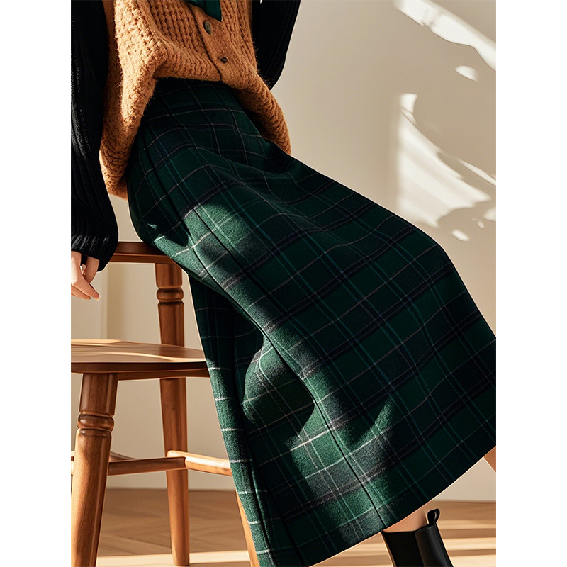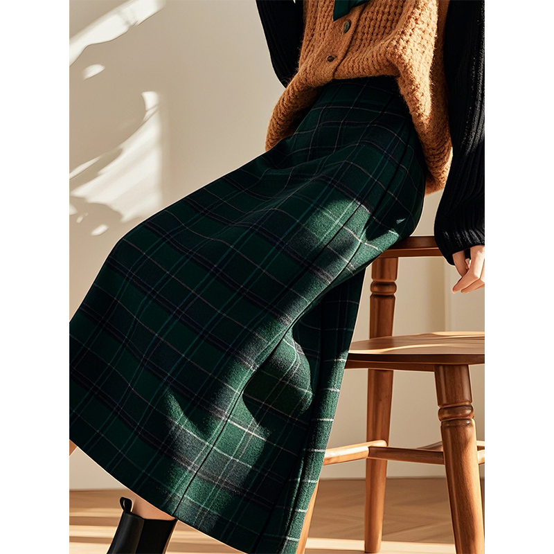 复古绿色格子毛呢半身裙女2025年秋冬新款 裙子 加厚高腰a字长款