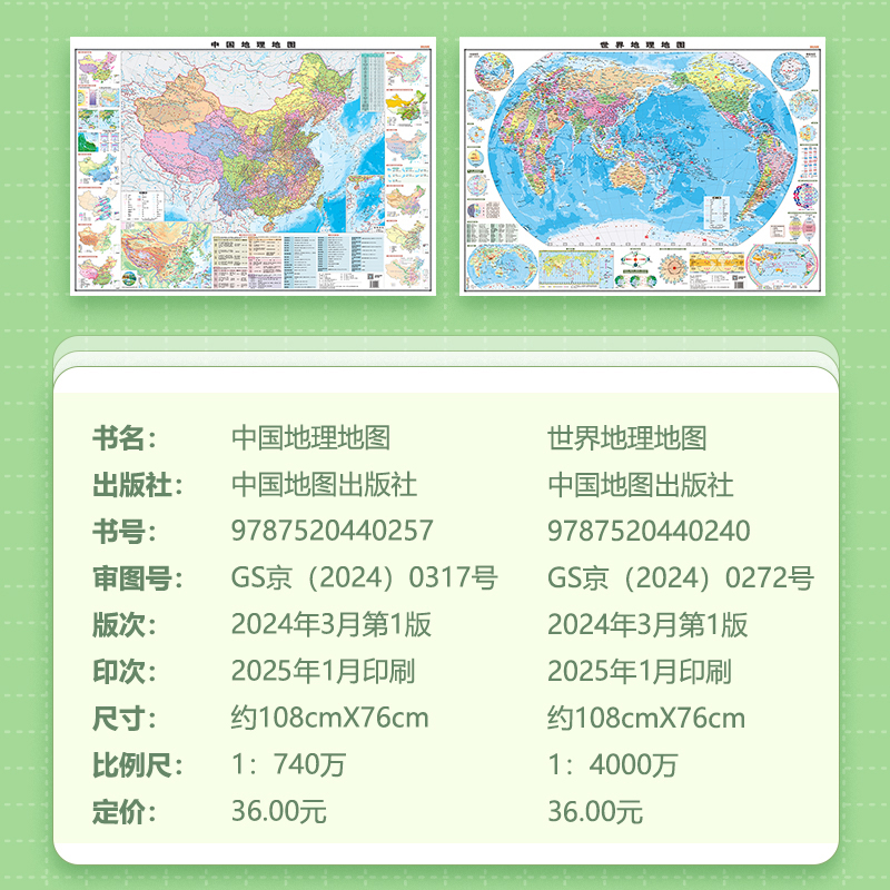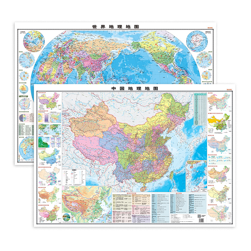 知识点多 政区地形 覆膜防水 小学中学适用 108cmX76cm 2025学生专用中国地理地图世界地理地图 考点提炼 贴图套装