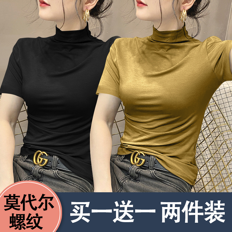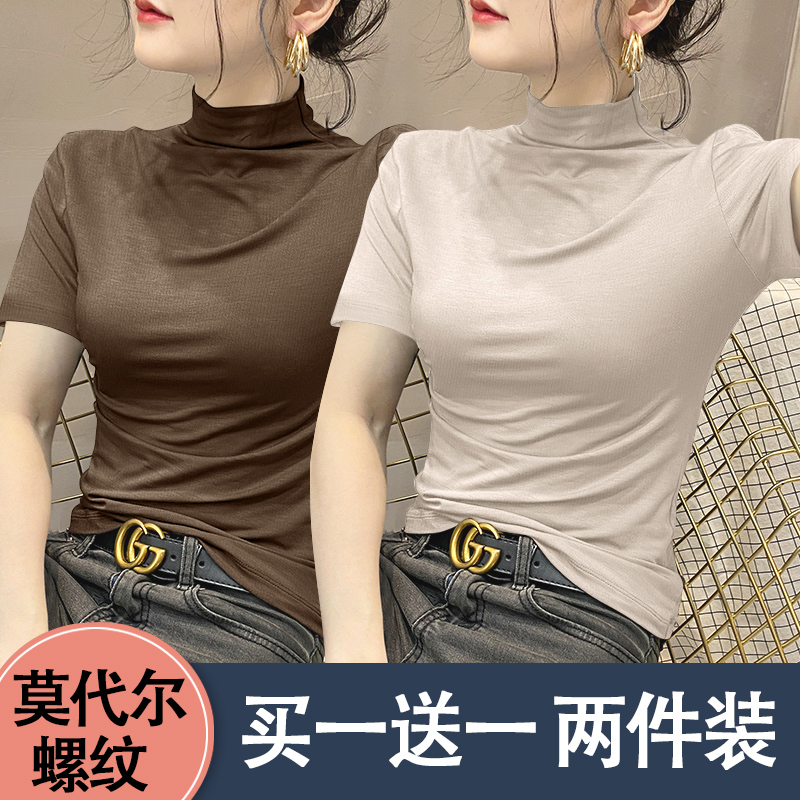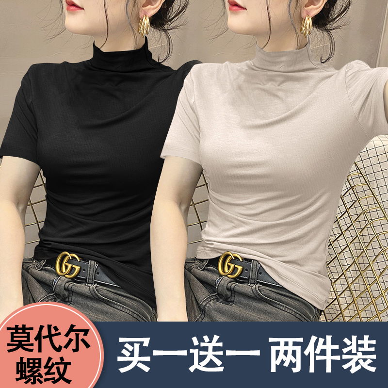 打底女衫 半高领螺纹短袖 显瘦百搭短袖 修身 上衣服 T恤女2025春夏款