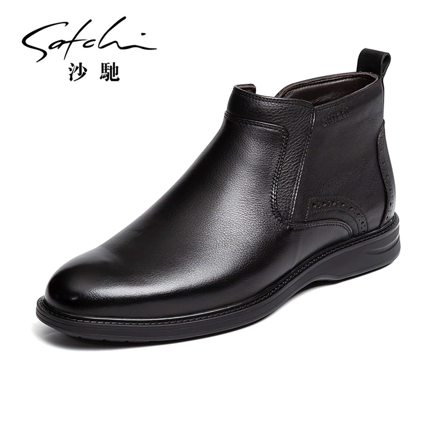 时尚 加绒保暖皮靴真皮牛皮高帮棉鞋 切尔西靴 旗舰店冬季 沙驰男鞋