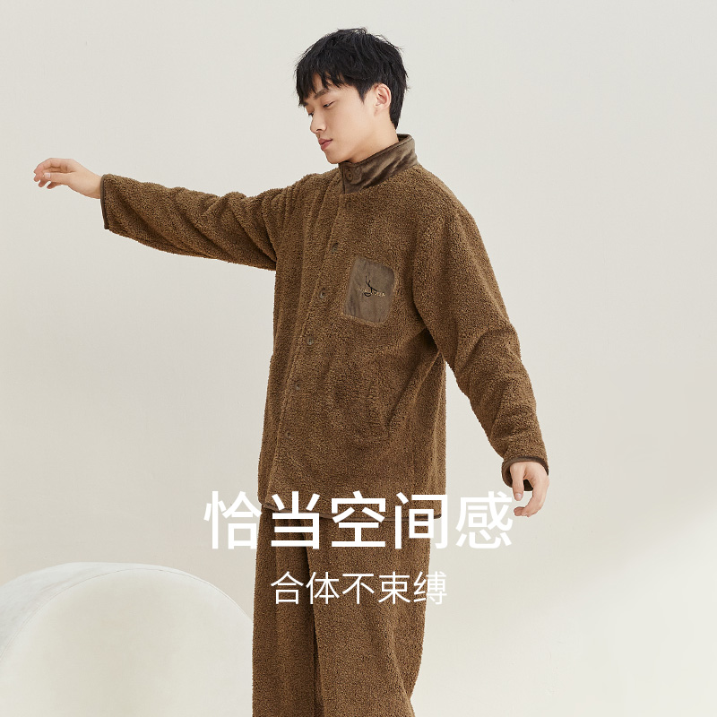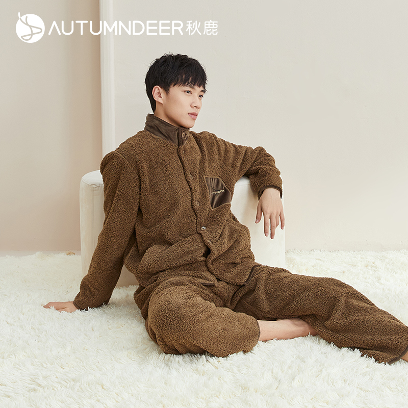 秋冬保暖男款 秋鹿立领珊瑚绒睡衣男冬季 加厚加绒可外穿家居服套装