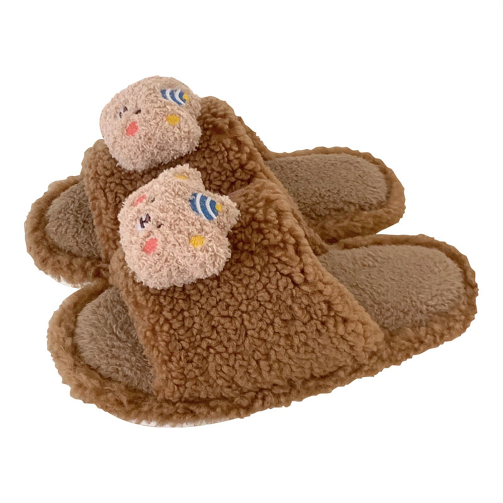 女 趣味可爱卡通小熊一字毛毛拖鞋 冬季 软底防滑舒适保暖居家棉拖鞋