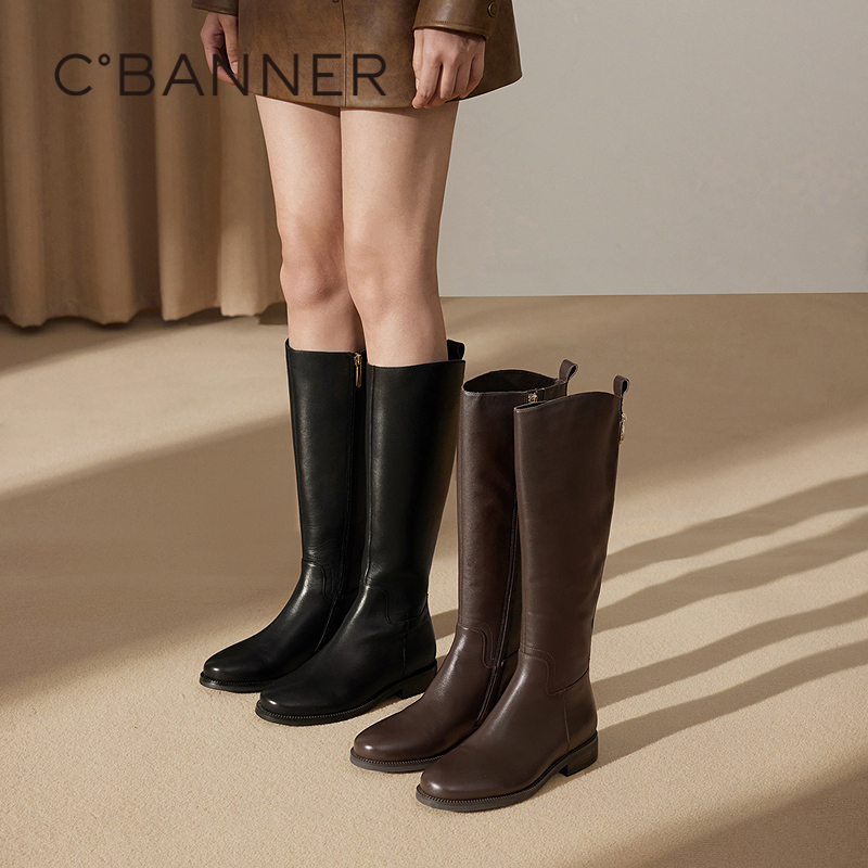 千百度粗跟高筒骑士靴百搭秋冬气质美拉德风真皮长靴女鞋 瘦瘦靴