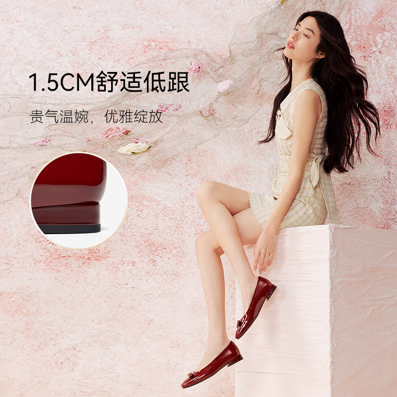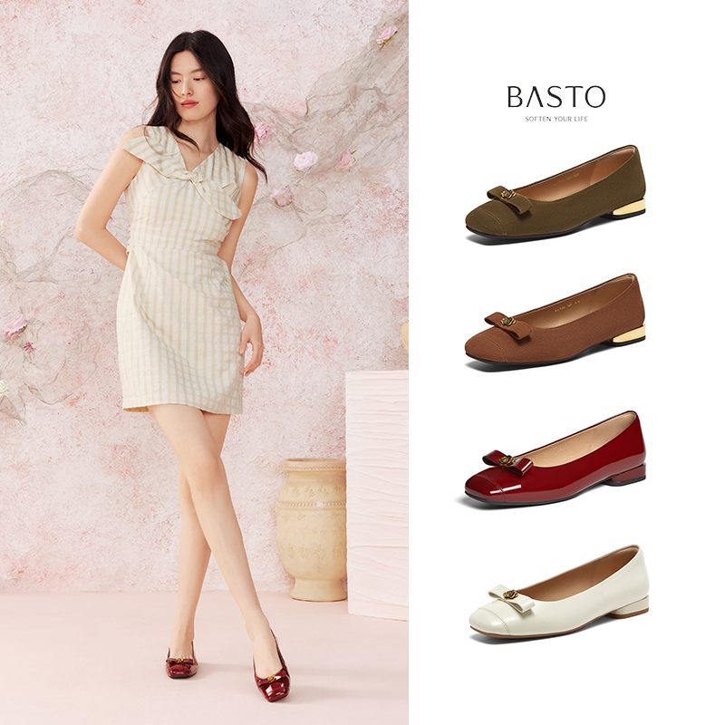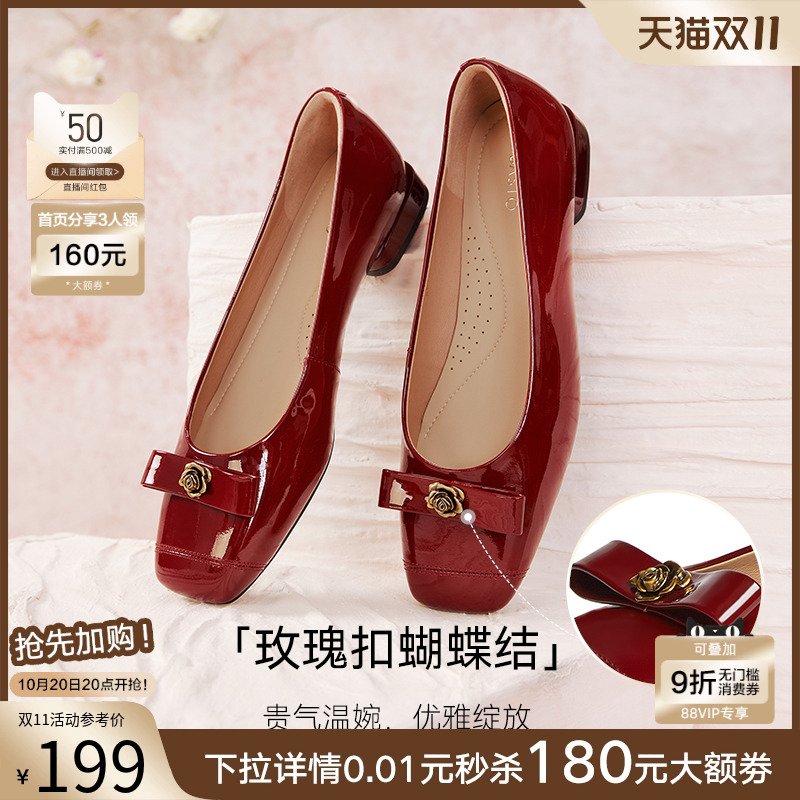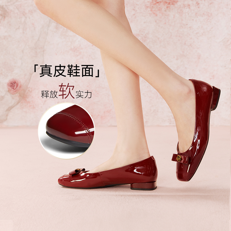 RE726AQ5 一脚蹬船鞋 百思图2025春新款 通勤方头粗跟浅口女红色单鞋