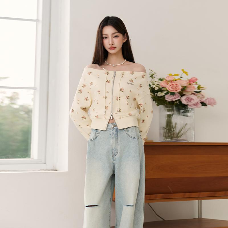 301355 女士米色碎花一字肩卫衣外套银泰百货 Three Quarters