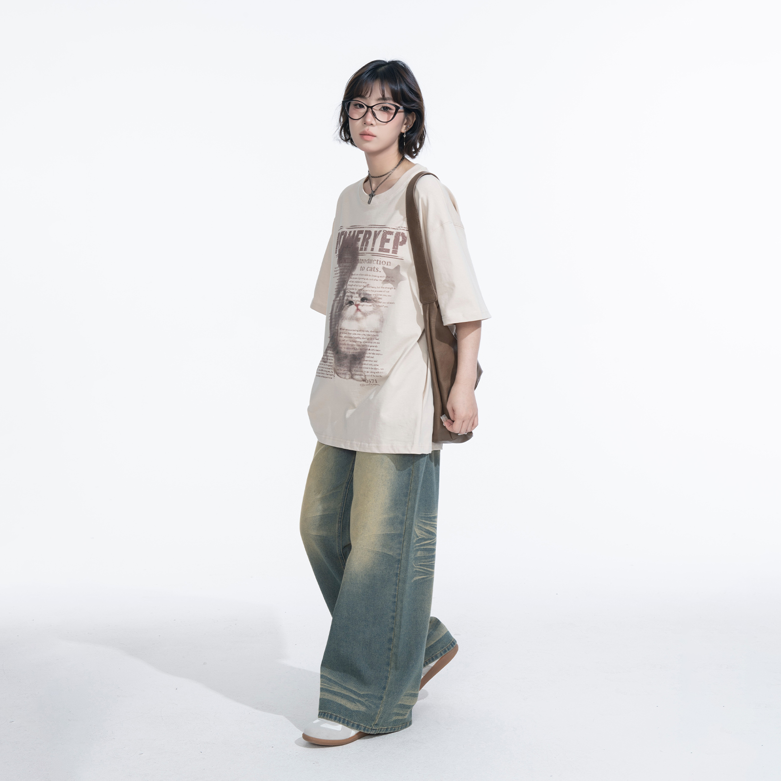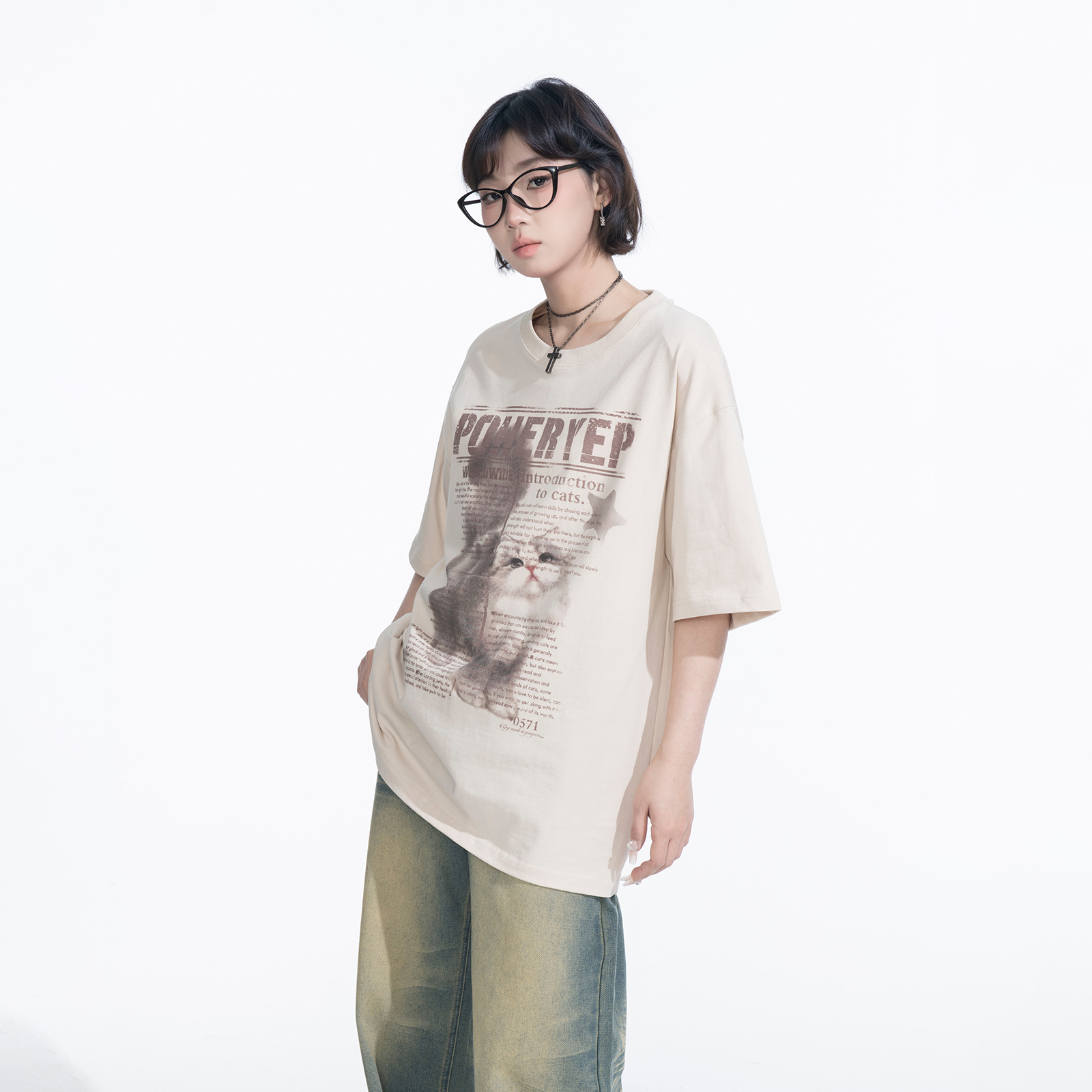 复古情侣半袖 2025新款 宽松潮牌上衣 t恤女春季 YEP卡通猫咪印花短袖