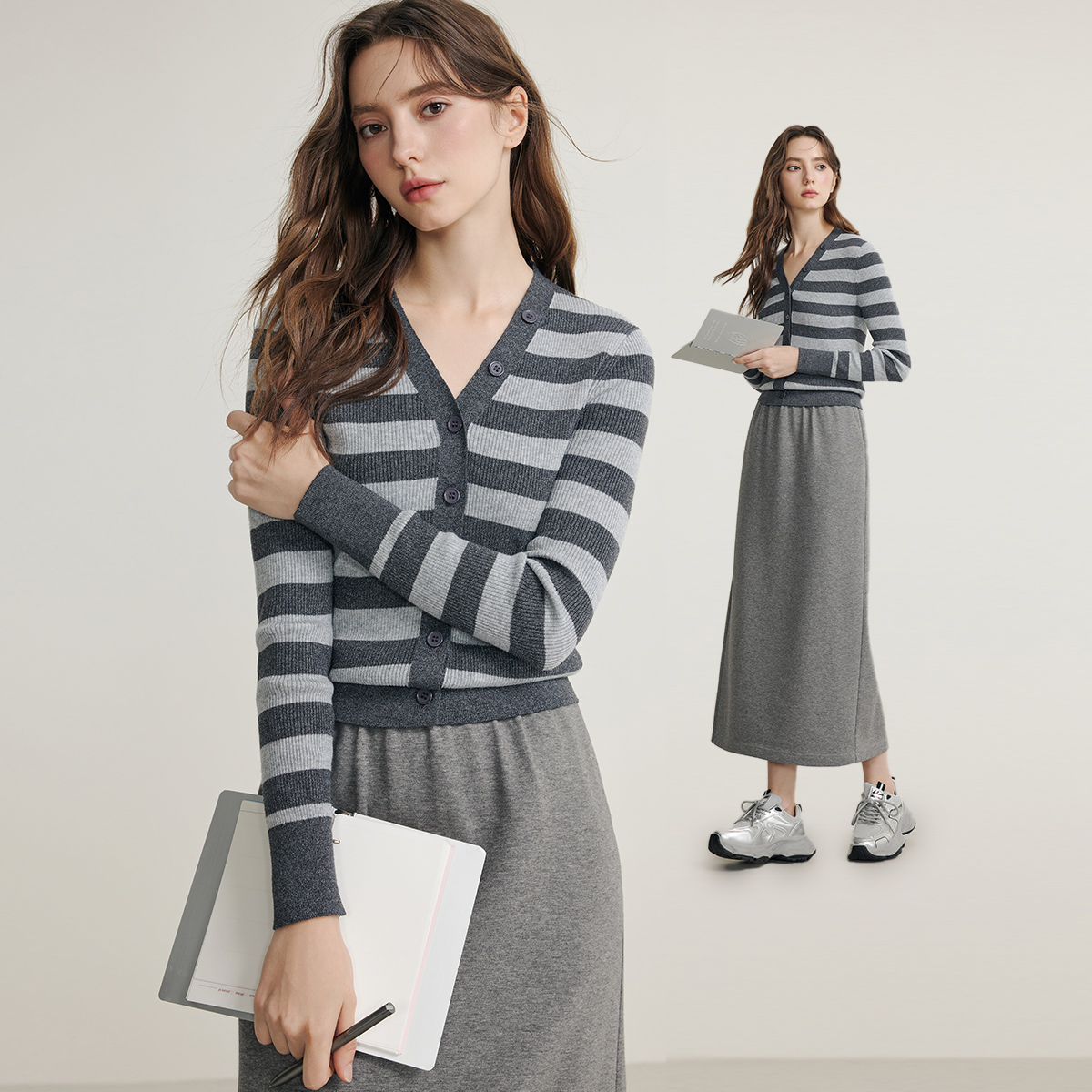 气质长袖 春秋新款 洋气上衣女 条纹开衫 KBNE灰色羊毛领毛衣针织衫