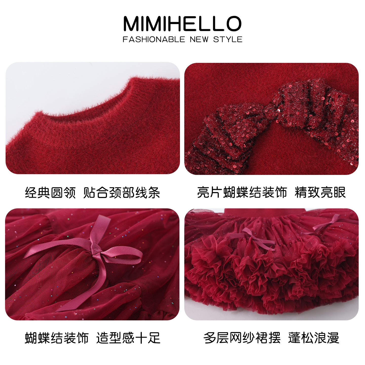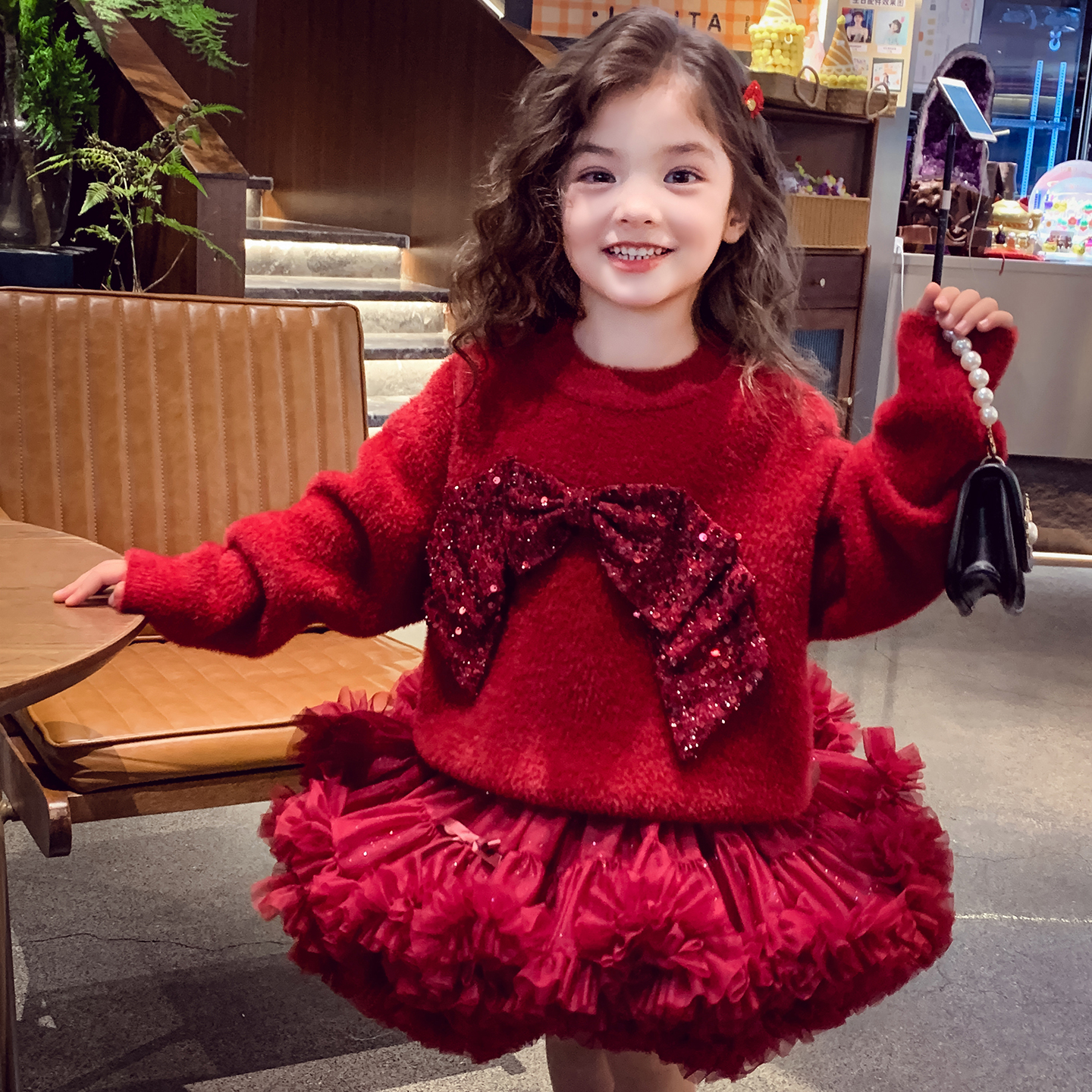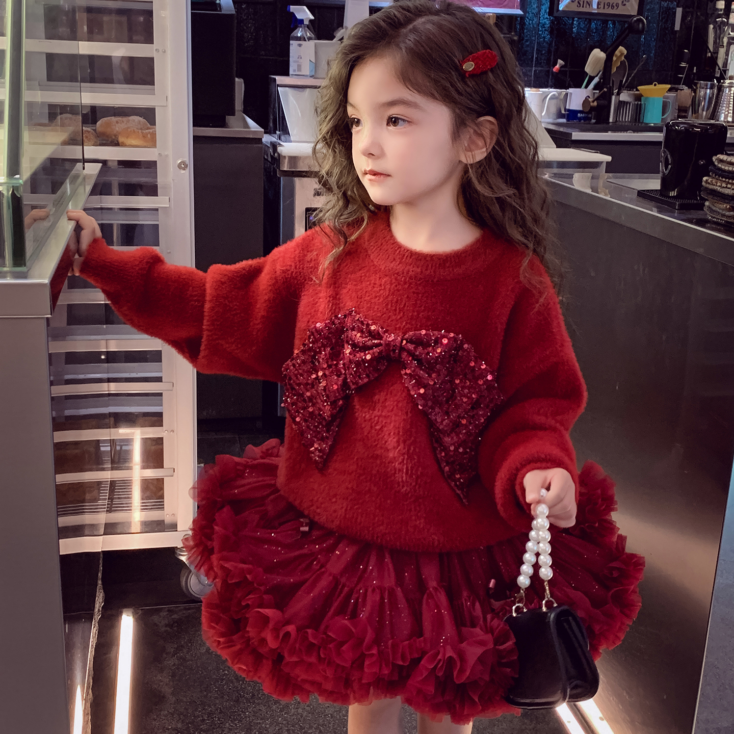 宽松韩版 2025新款 圆领毛衣女孩蓬蓬裙两件套 冬装 女童新年红色套装
