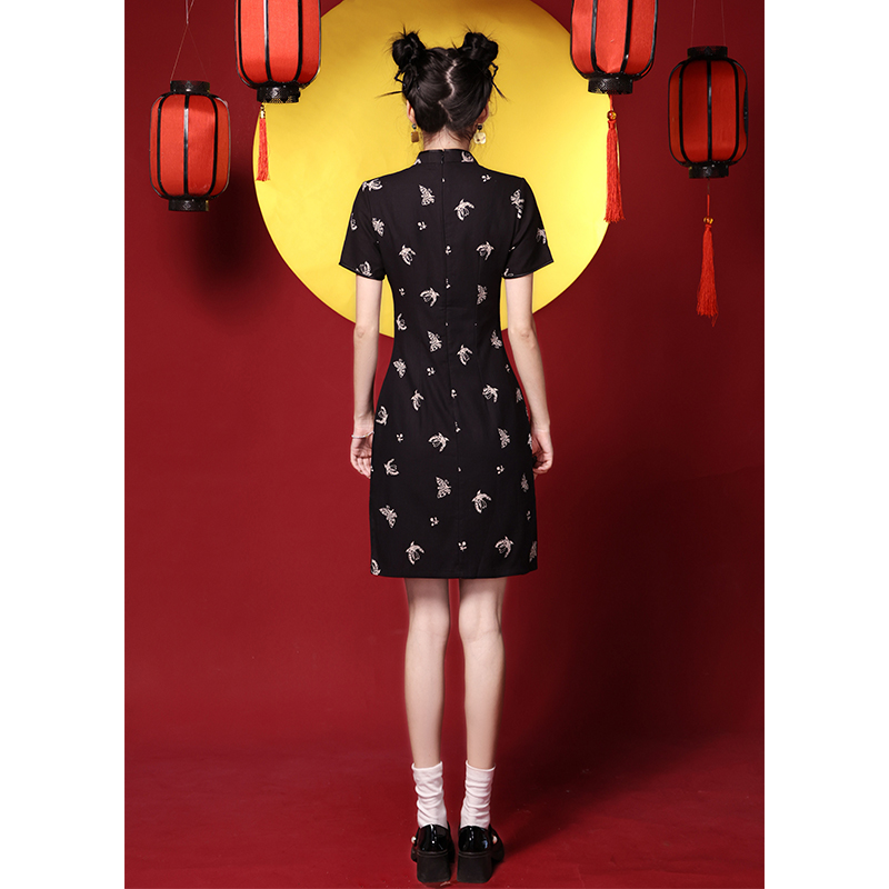 新中式 玲珑丹青 遮肚改良黑色重工鱼尾裙微胖显瘦旗袍 babes