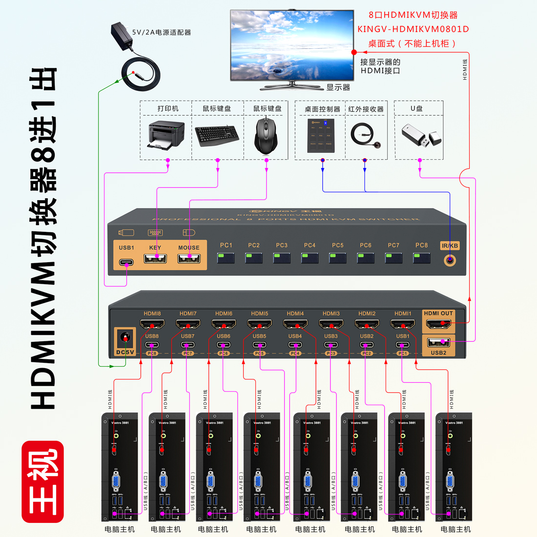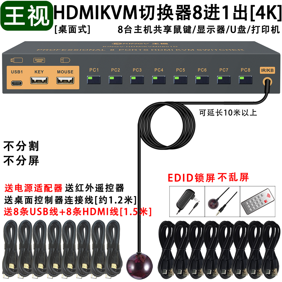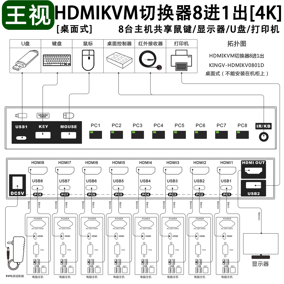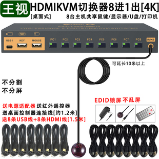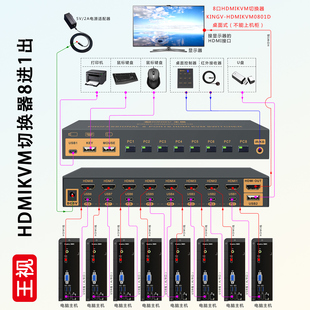王视 kvm切换器hdmi八进一出kvm切换器8进1出8台主机共享鼠标键盘显示器u盘打印机usb设备4k高清口