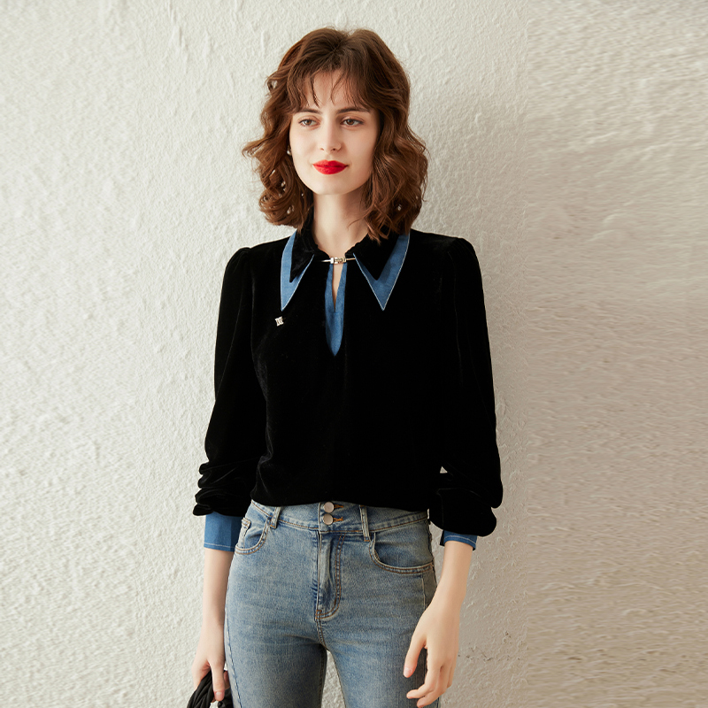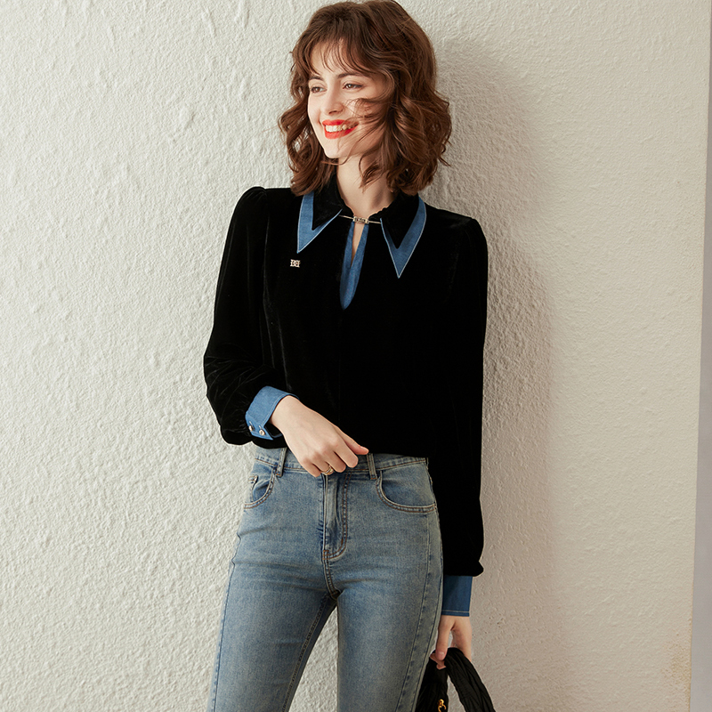 修身 秋冬短款 长袖 女新款 上衣蓝色衬衣女 磨毛收腰衬衫 娅丽达法式