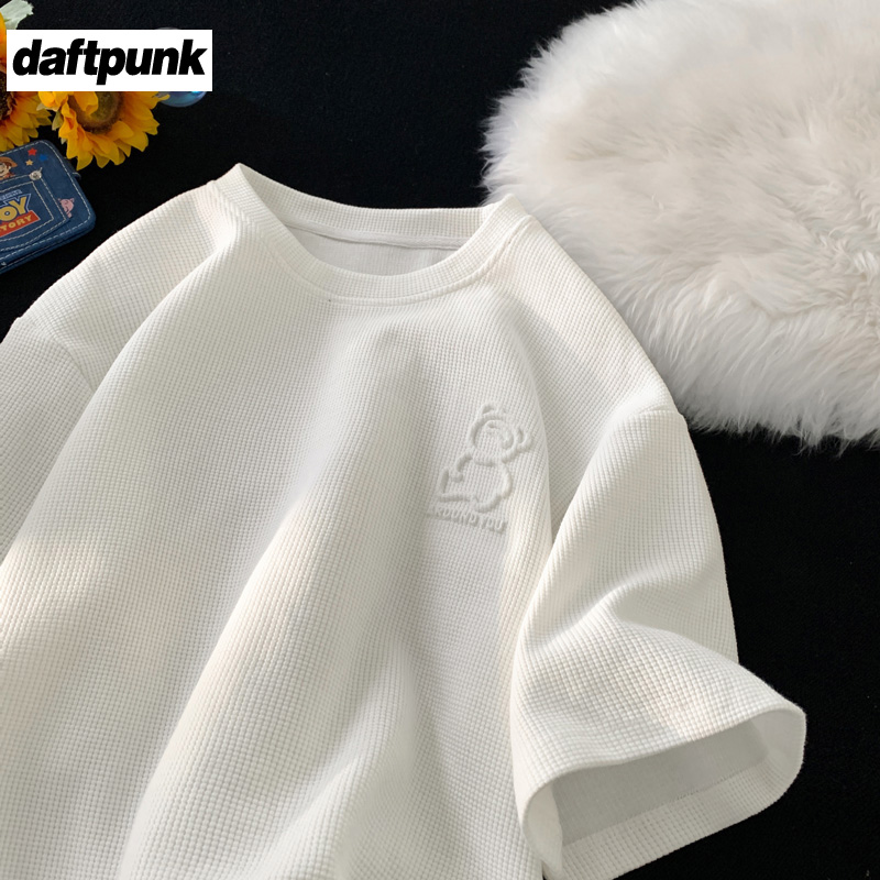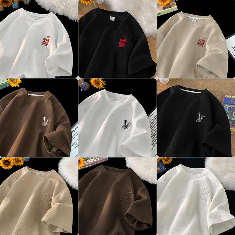 上衣 日系复古小熊钢印体恤青少年休闲半袖 华夫格短袖 t恤男女夏季