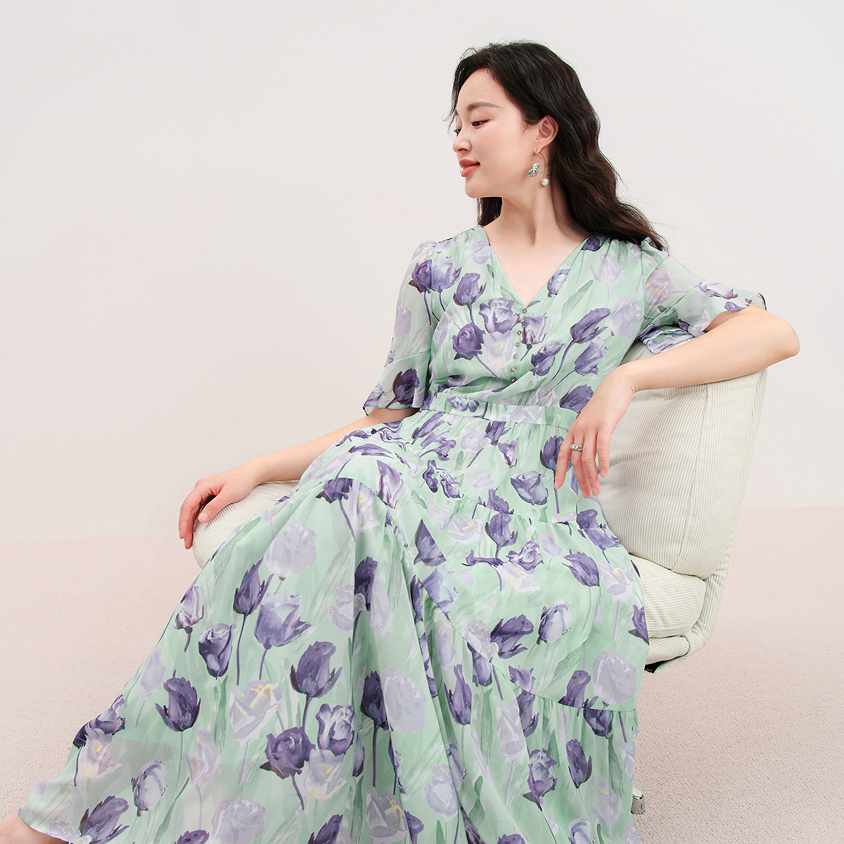 圆领印花连衣裙女薄款 5折 新多色长款 忆旧夏季 飘逸长裙子 沐光