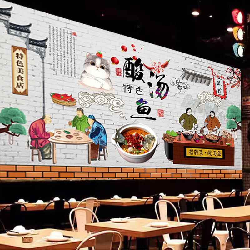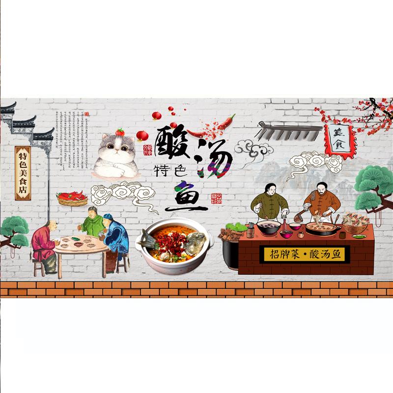 贵州凯里酸汤鱼壁纸创意墙面装 饰饭店餐厅室内防水背胶贴纸画自粘