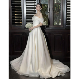 高端一字肩轻婚纱2025新款 新娘敬酒服迎宾订婚礼服裙出门白色结婚