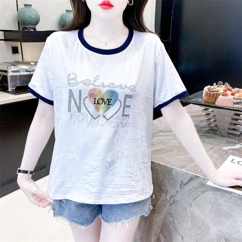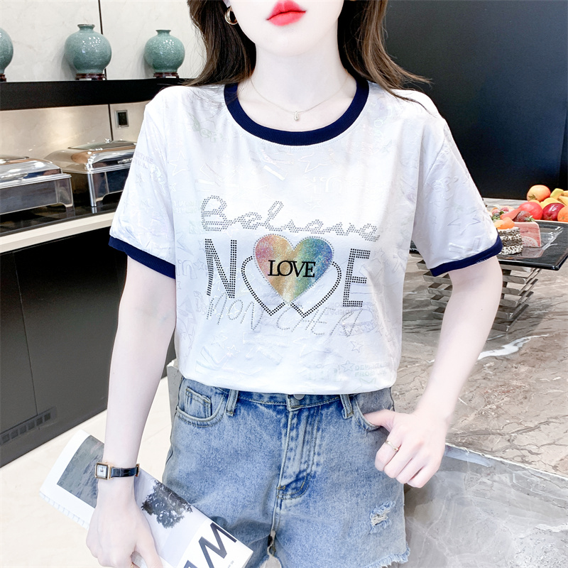 宽松休闲百搭气质圆领体恤 新款 重工爱心烫钻撞色短袖 T恤女夏季