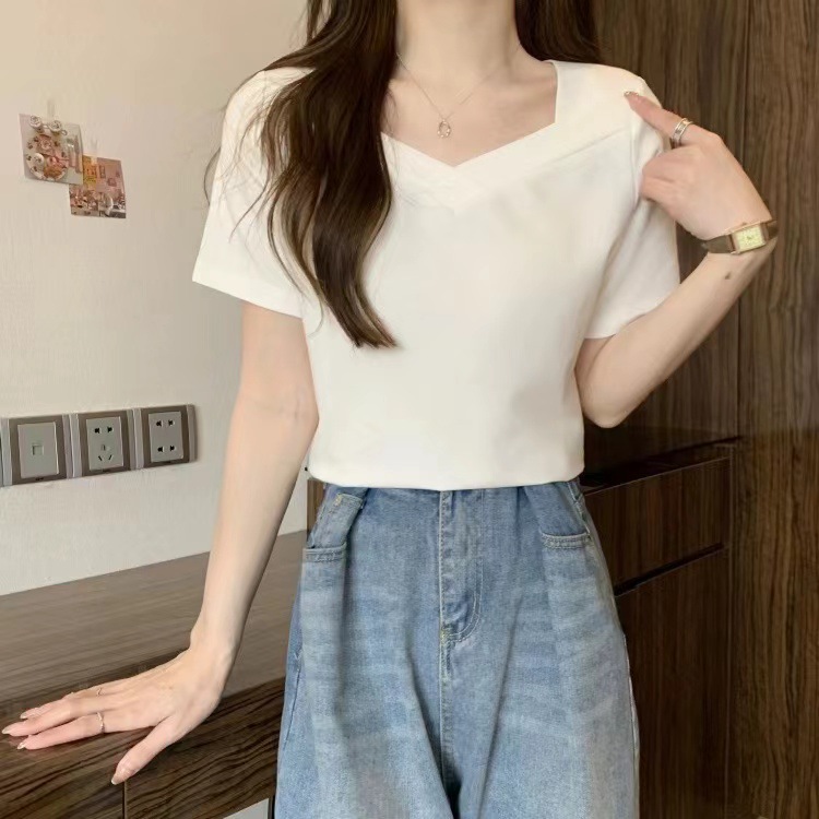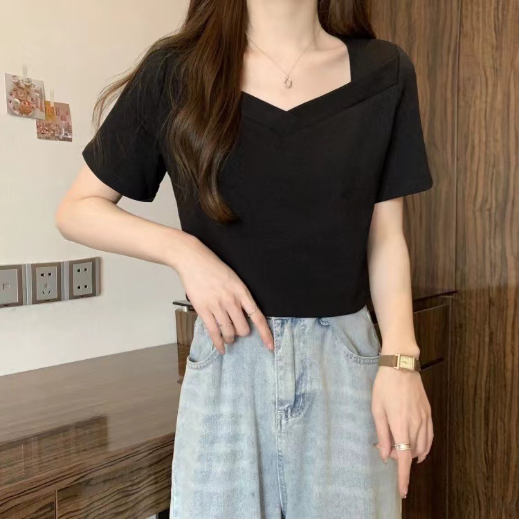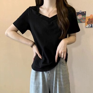 显瘦半袖 辣妹甜飒风纯欲V领露锁骨短袖 修身 韩版 体恤上衣 T恤女夏季