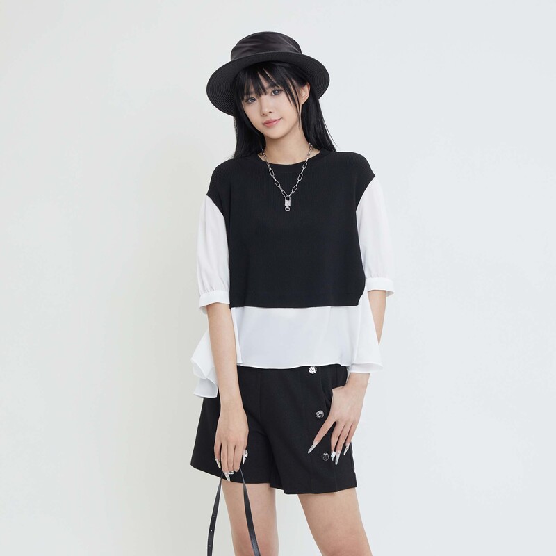 S24283510 罗纹圆领拼接不规则针织衫 sdeer圣迪奥夏装 女装