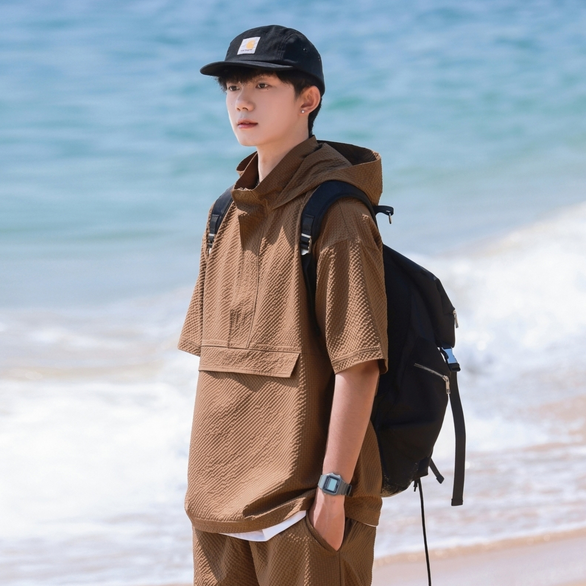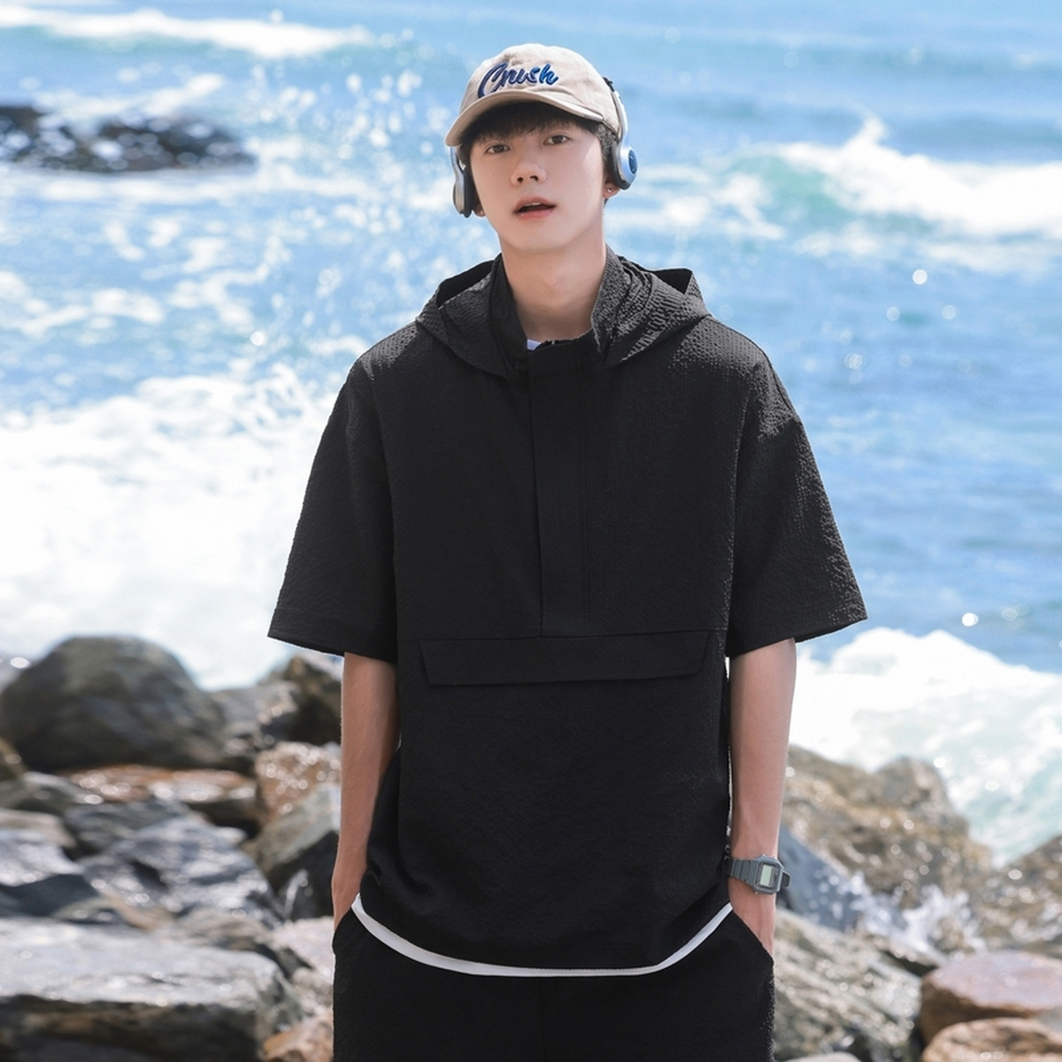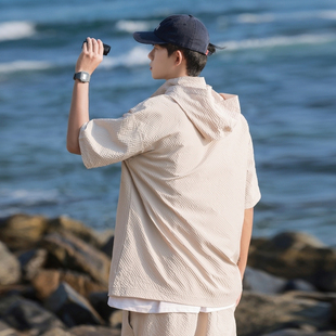 泡泡布运动设计休闲 T恤连帽薄款 雪中飞2025春秋新款 男女情侣短袖