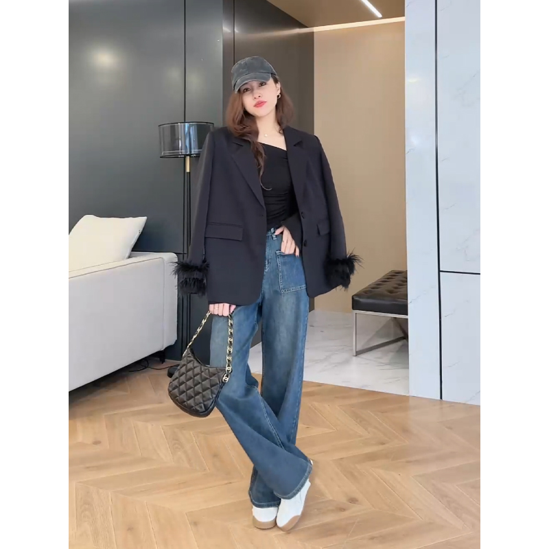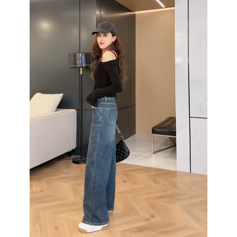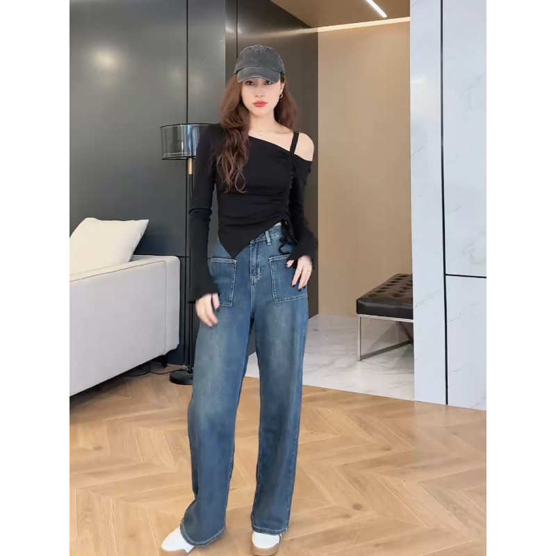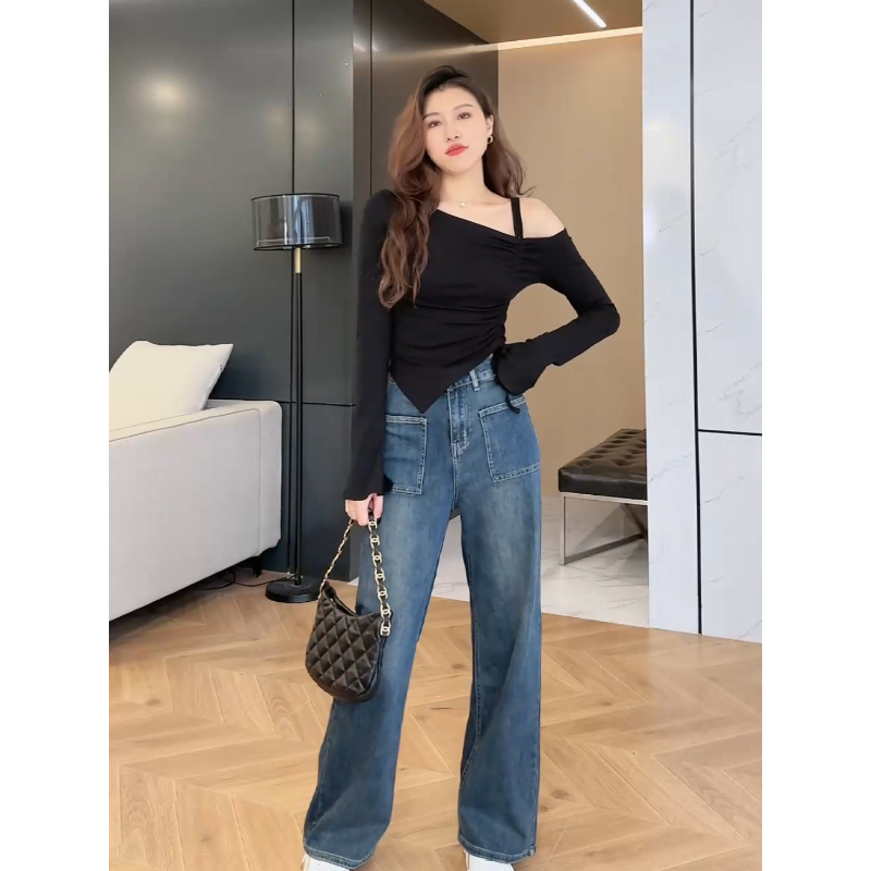 随意出街 高腰口袋牛仔裤 2023秋季 斜露肩气质上衣 新款 张阿星