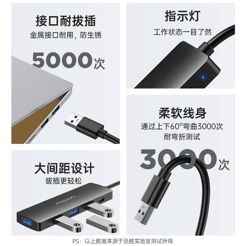 品胜usb3.0扩展器插头多口集分线器笔记本电脑外接u盘硬盘转接头typec供电短线拓展坞一拖四转接延长hub转换