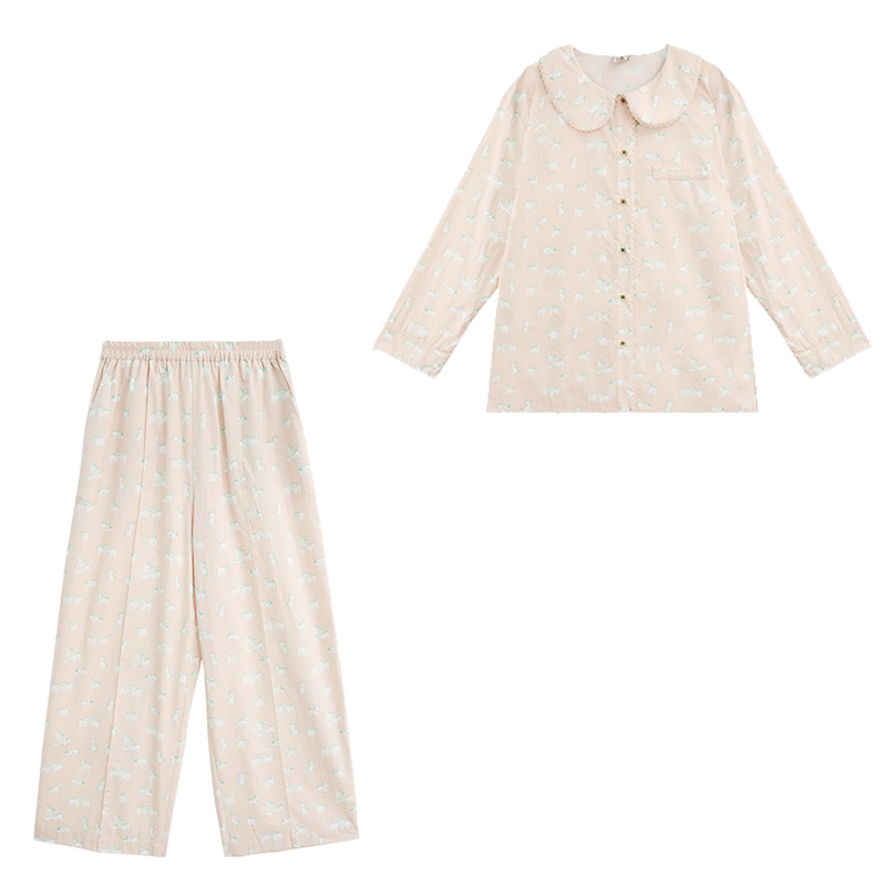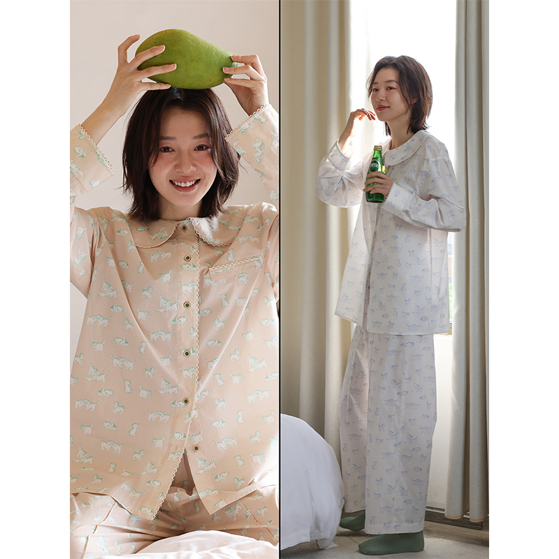 宽松休闲加大码 芬腾女士睡衣春秋纯棉长袖 新款 套装 全棉家居服 开衫