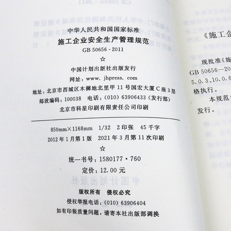 现货正版 中国计划出版 2011施工企业安全生产管理规范 社 50656