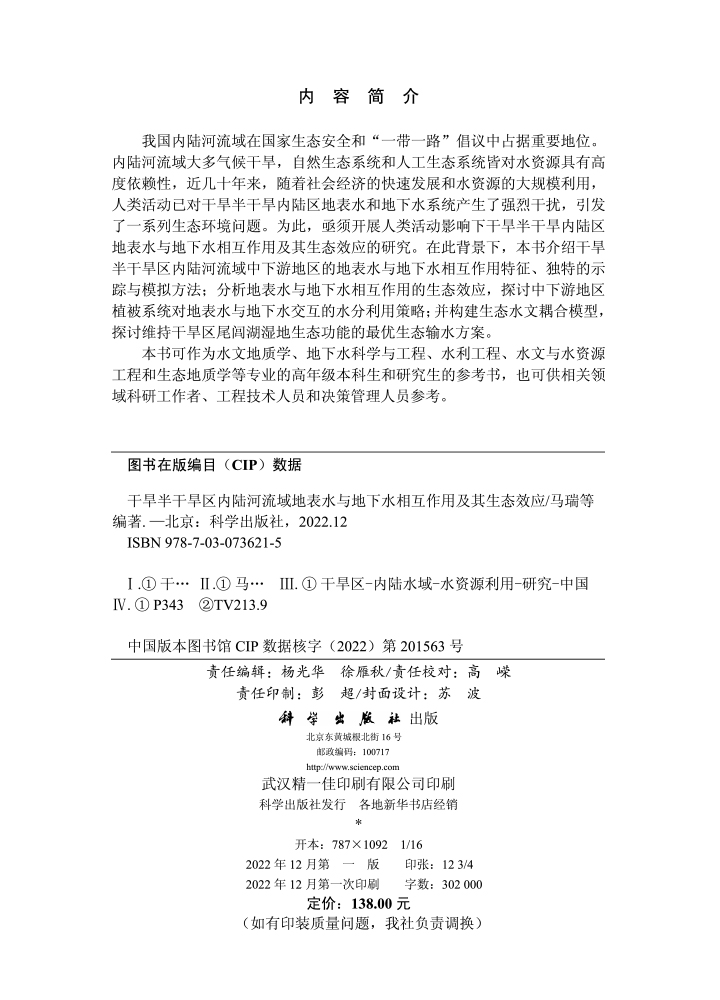 王云权等 马瑞 科学 龙门书局出版 9787030736215 现货正版 社 干旱半干旱区内陆河流域地表水与地下水相互作用及其生态效应