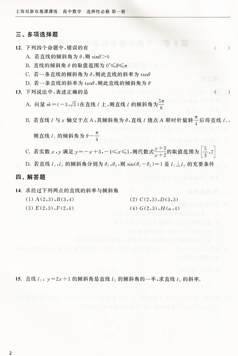 高二年级第二学期 高2下册 上海版 上海双新双基课课练 上海科学普及出版 选择性必修1第一册 新课改配套辅导 社 高中数学