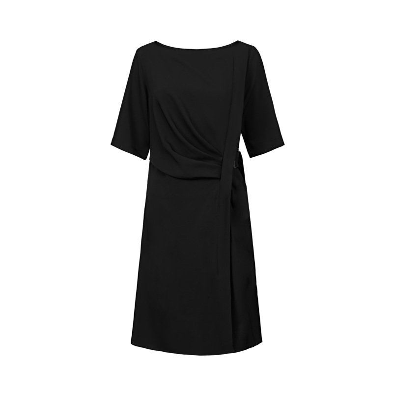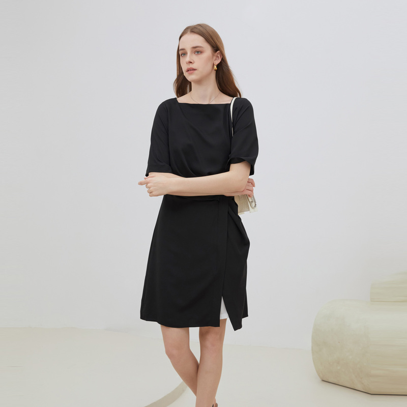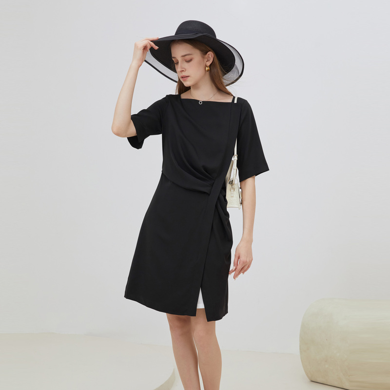 连衣裙S223Z120Q 小黑裙方领立体裁剪收腰半袖 sdeer圣迪奥女装 夏装