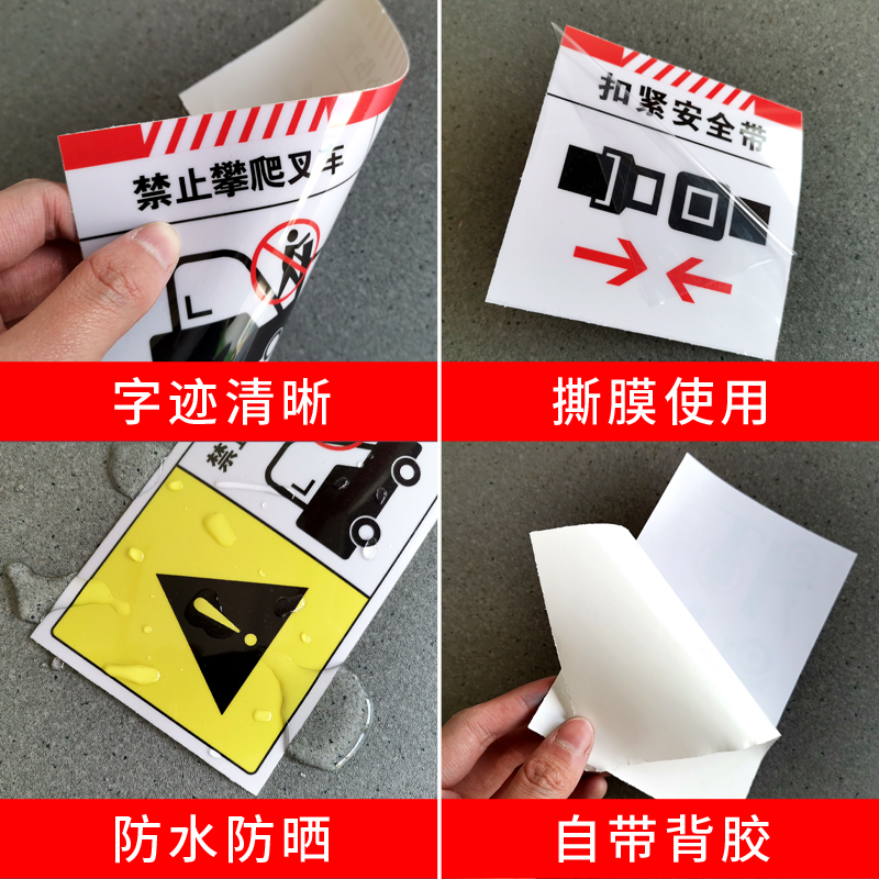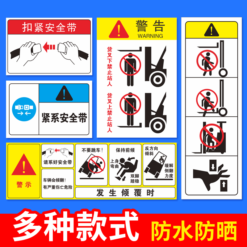 叉车安全警示标志当心伤手禁止货叉下站人安全标识牌请系好安全带禁止攀爬叉车禁止在货叉上停留标语警示贴纸