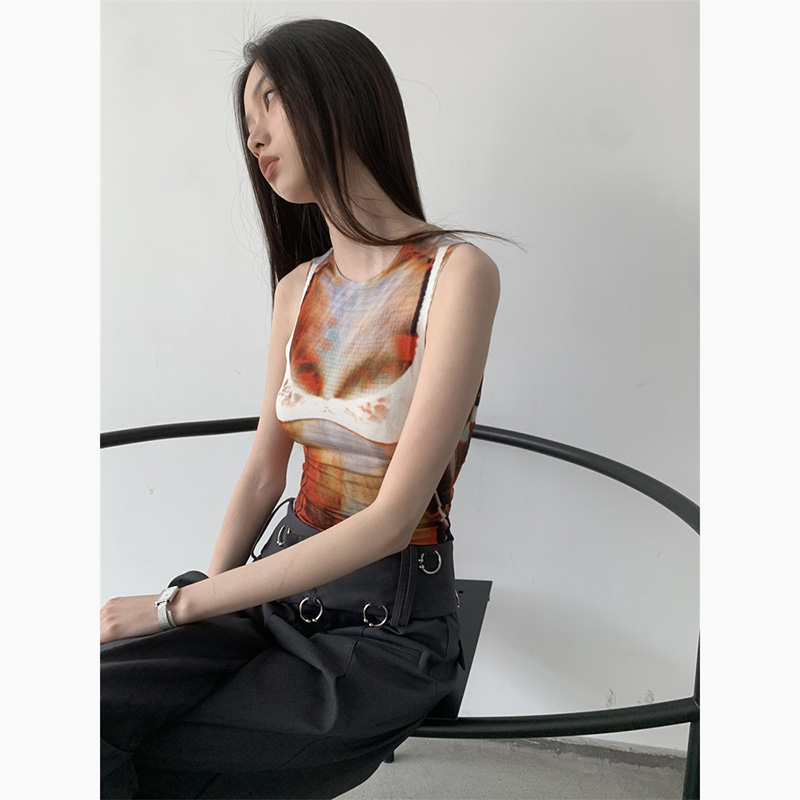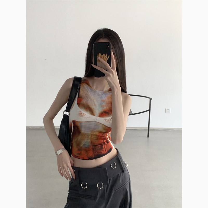 圆领背心上衣女 型短款 热辣复古个性 辣妹撞色印花收腰修身