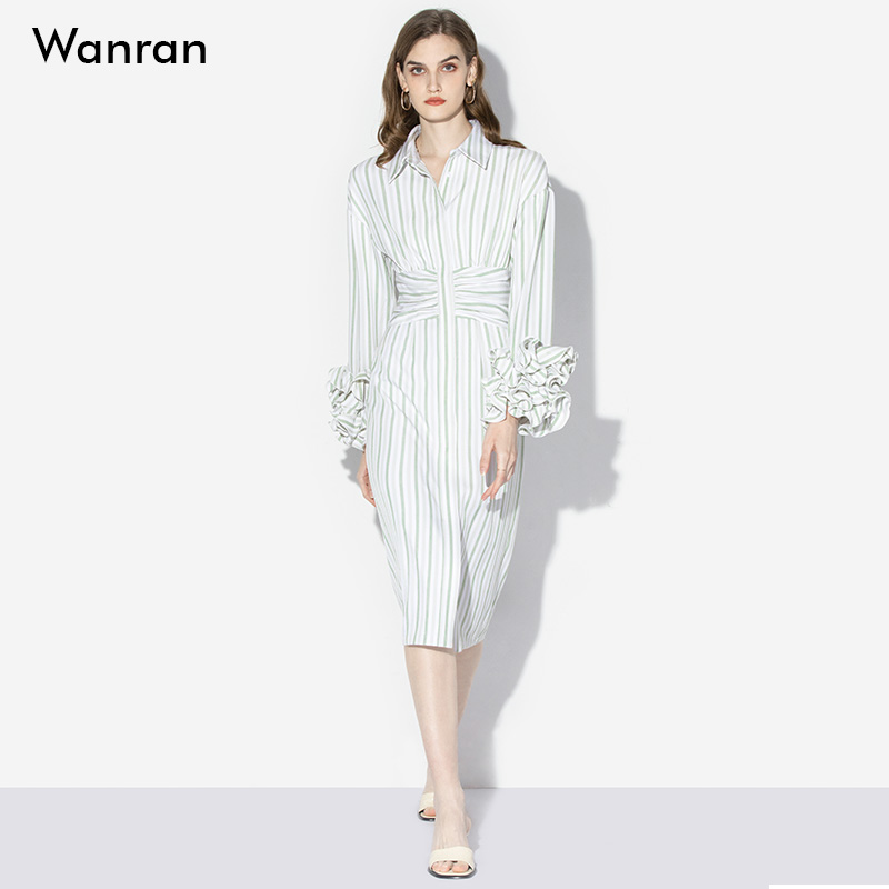 新款 口木耳边OL风绿色条纹显瘦衬衫 时尚 领袖 裙 气质衬衫 2025秋季