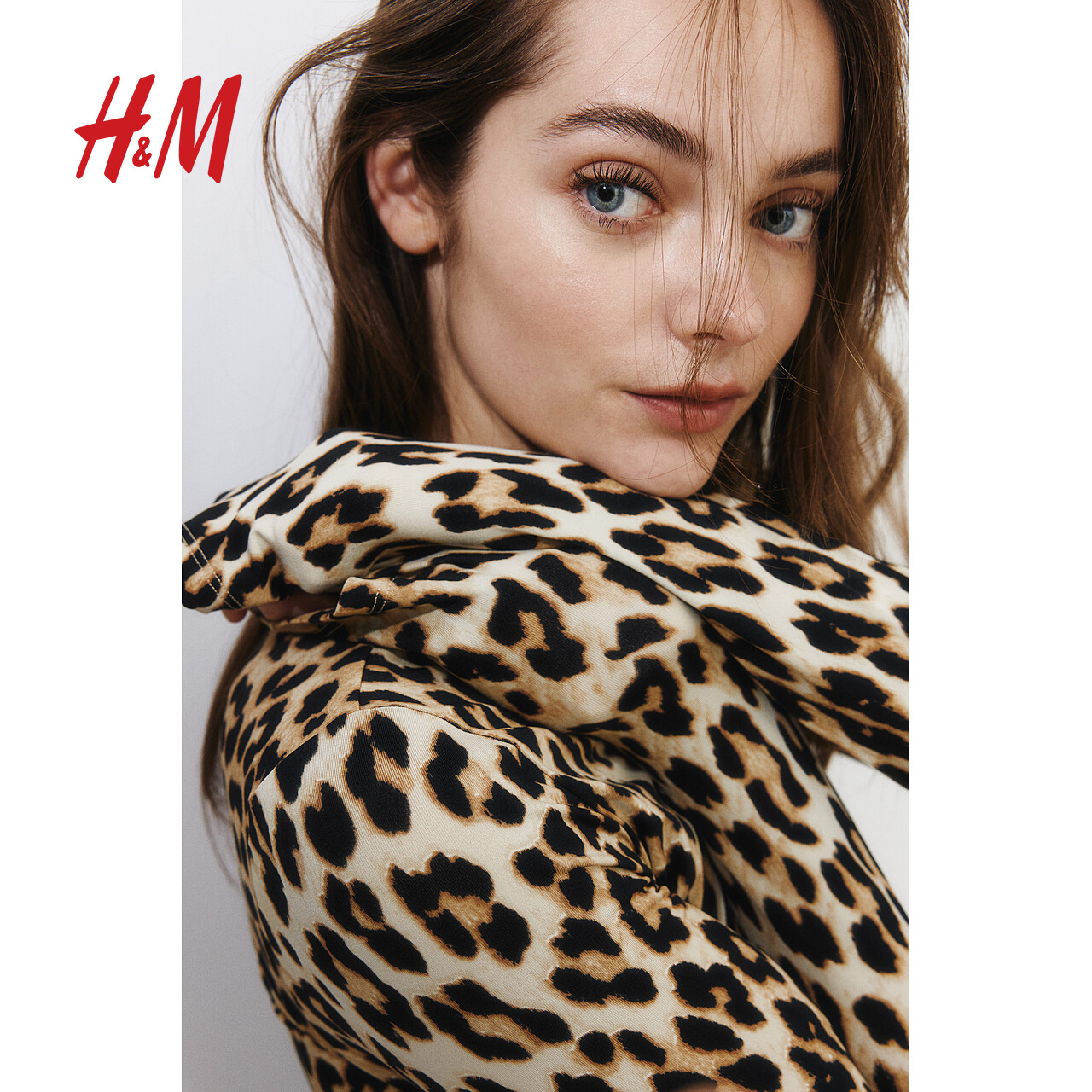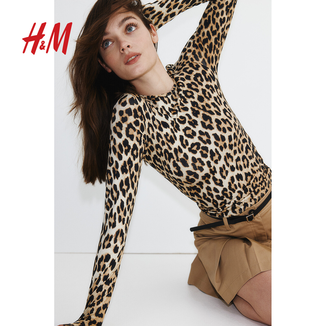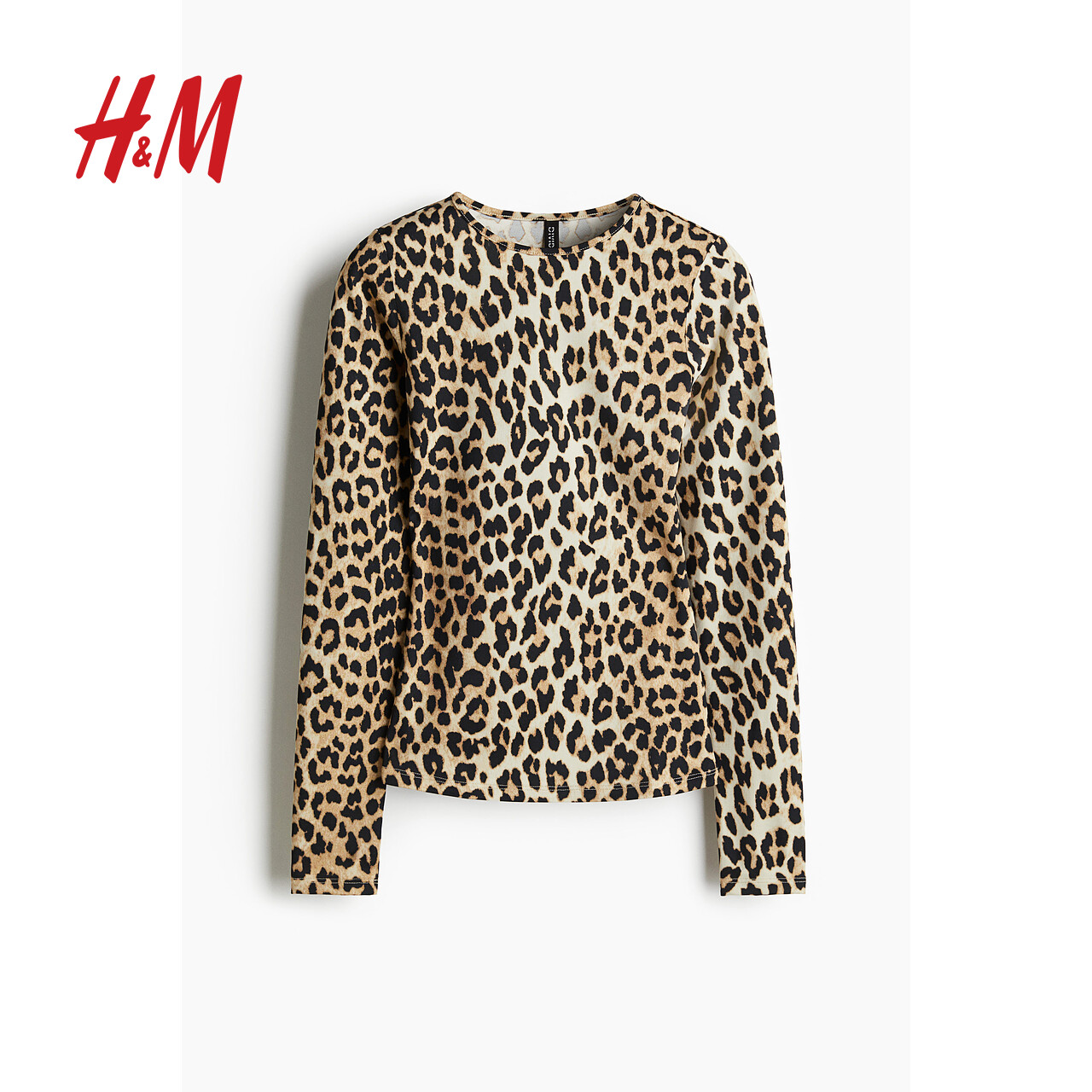 T恤2025秋季 长袖 新款 气质印花圆领内搭修身 上衣1294075 时尚 HM女装