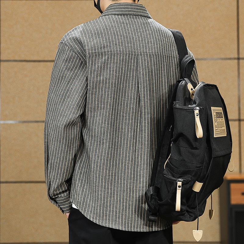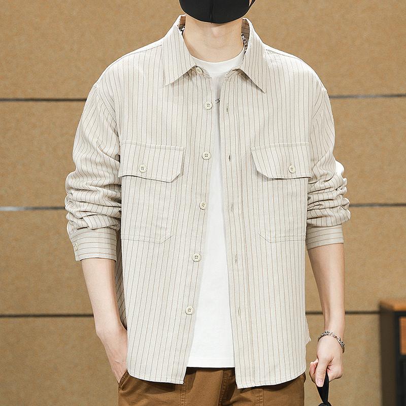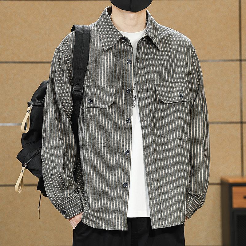 潮牌宽松休闲长袖 美式 2025新款 男秋季 衬衣外套男 复古棉麻条纹衬衫